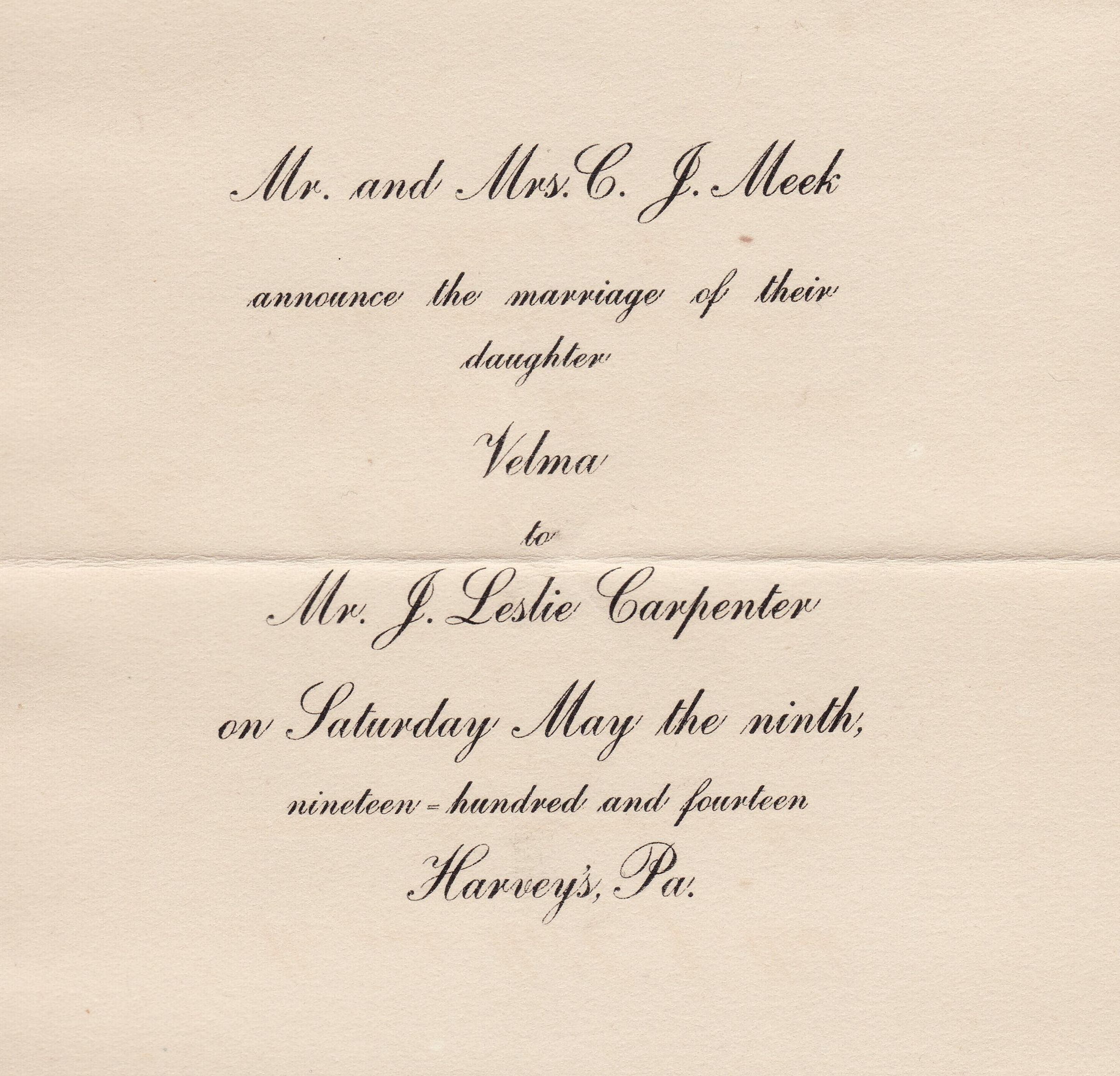 SOURCE CITATION: Carpenter-Meek wedding invitation; wedding date 9 May 1914; item no. CARP-AN005-0025, Sellers Burdette and Bettie (Blake) Carpenter Collection, shared by their heirs; Greene Connections Archives Project (GreeneConnections.com).