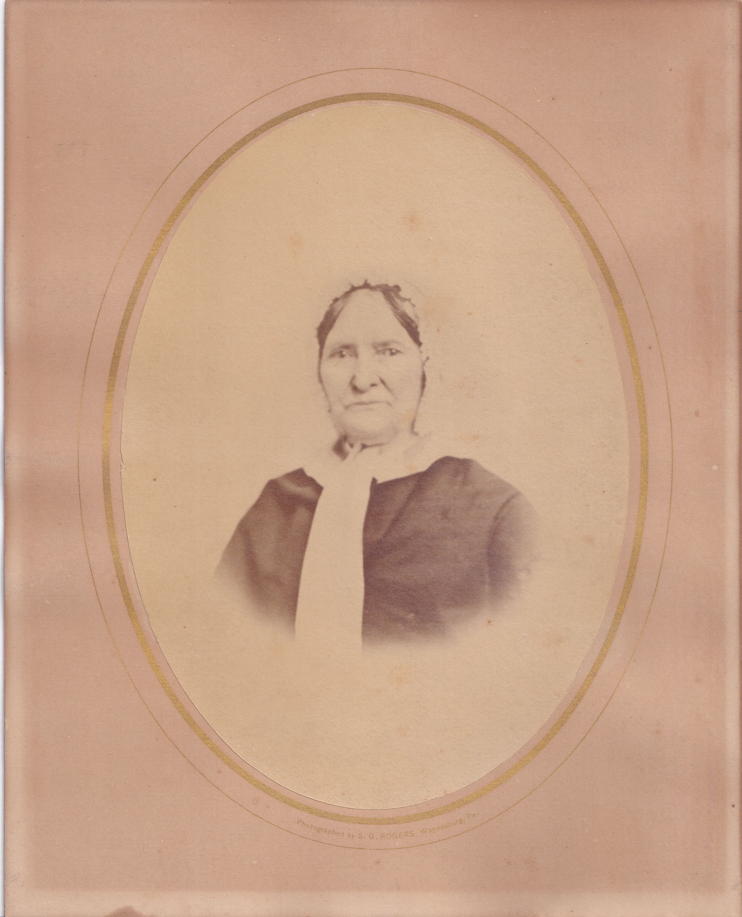 SOURCE CITATION: Elizabeth (Luckey) McConnell [1786-1863] - wife of James McConnell [1784-1840]; image is an 1870s-era reproduction by S. G. Rogers, Waynesburg, Pa., of an earlier 1850s-1860s era photograph; item no. CGSP-AN014-0001, Anna Mary (Ritchie) Armstrong Series, donated by Suzanne Floyd, 2022; Cornerstone Genealogical Society Collection, Greene Connections Archives Project (www.GreeneConnections.com).