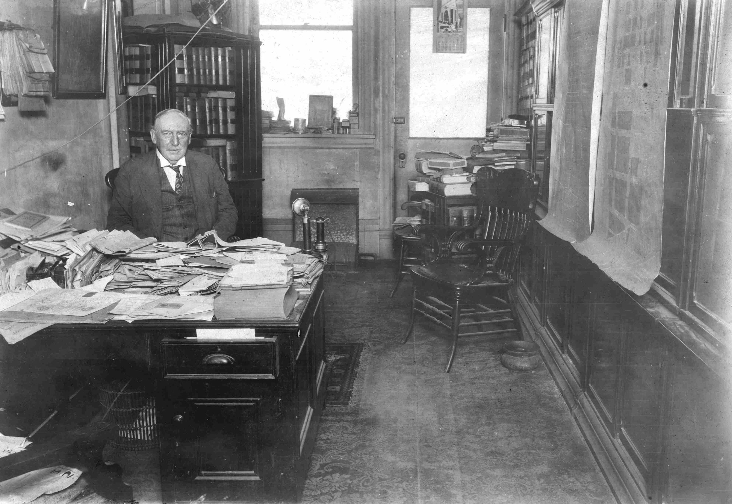 Dated August 1928. Daniel Spindler Walton [1853-1934] at his office in the Peoples National Bank Building on High Street in Waynesburg, Greene County, Pennsylvania.