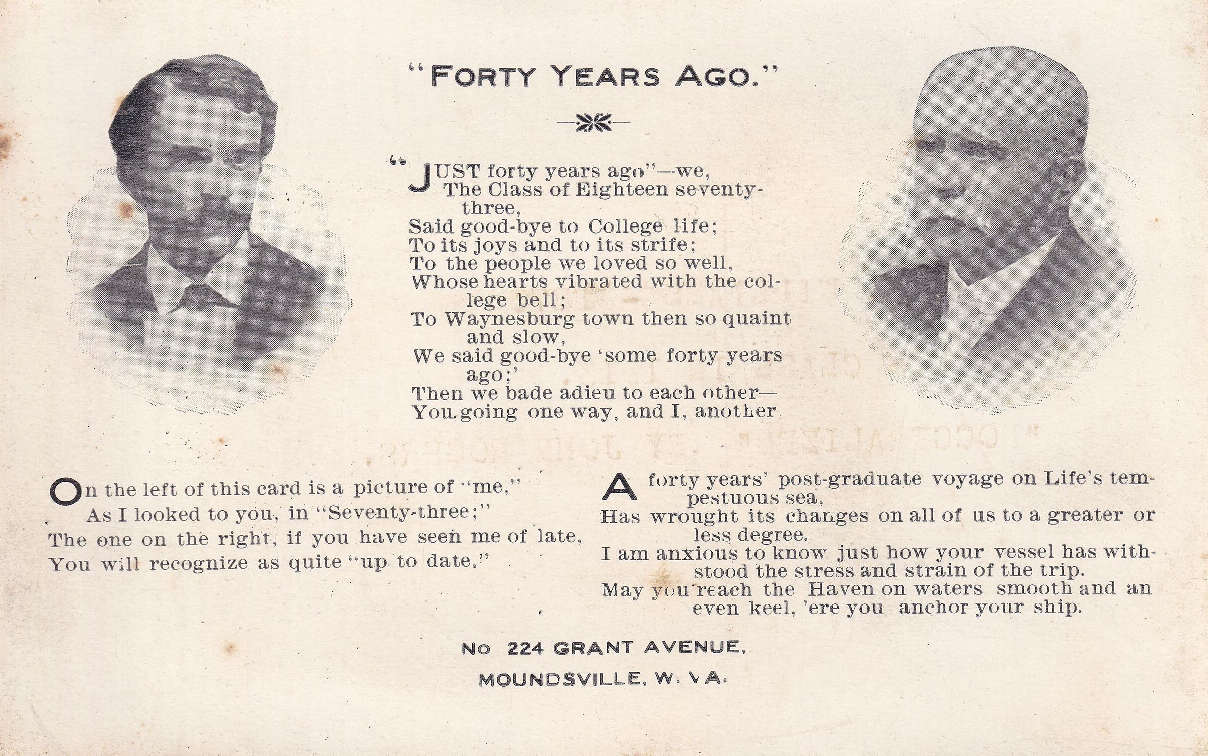 SOURCE CITATION: Postcard created by Daniel Theodore Williams, Waynesburg College, Class of 1873, to be sent to his classmates in 1913; dated 1913, published by T. R. Rogers & Sons, 507 Seventh St., Moundsville, W. Va.; item no. WAYN_AN001_1873_0025, Waynesburg University Paul R. Stewart Museum Collection; Greene Connections Archives Project (GreeneConnections.com).