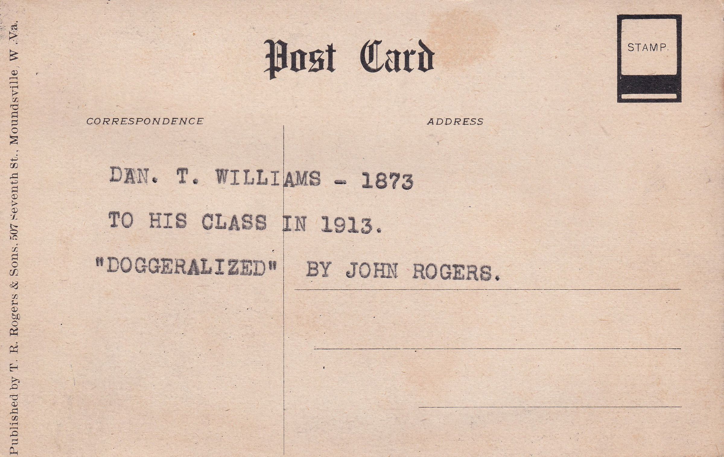 Original, published by T. R. Rogers & Sons, 507 Seventh St., Moundsville, W. Va.Collection