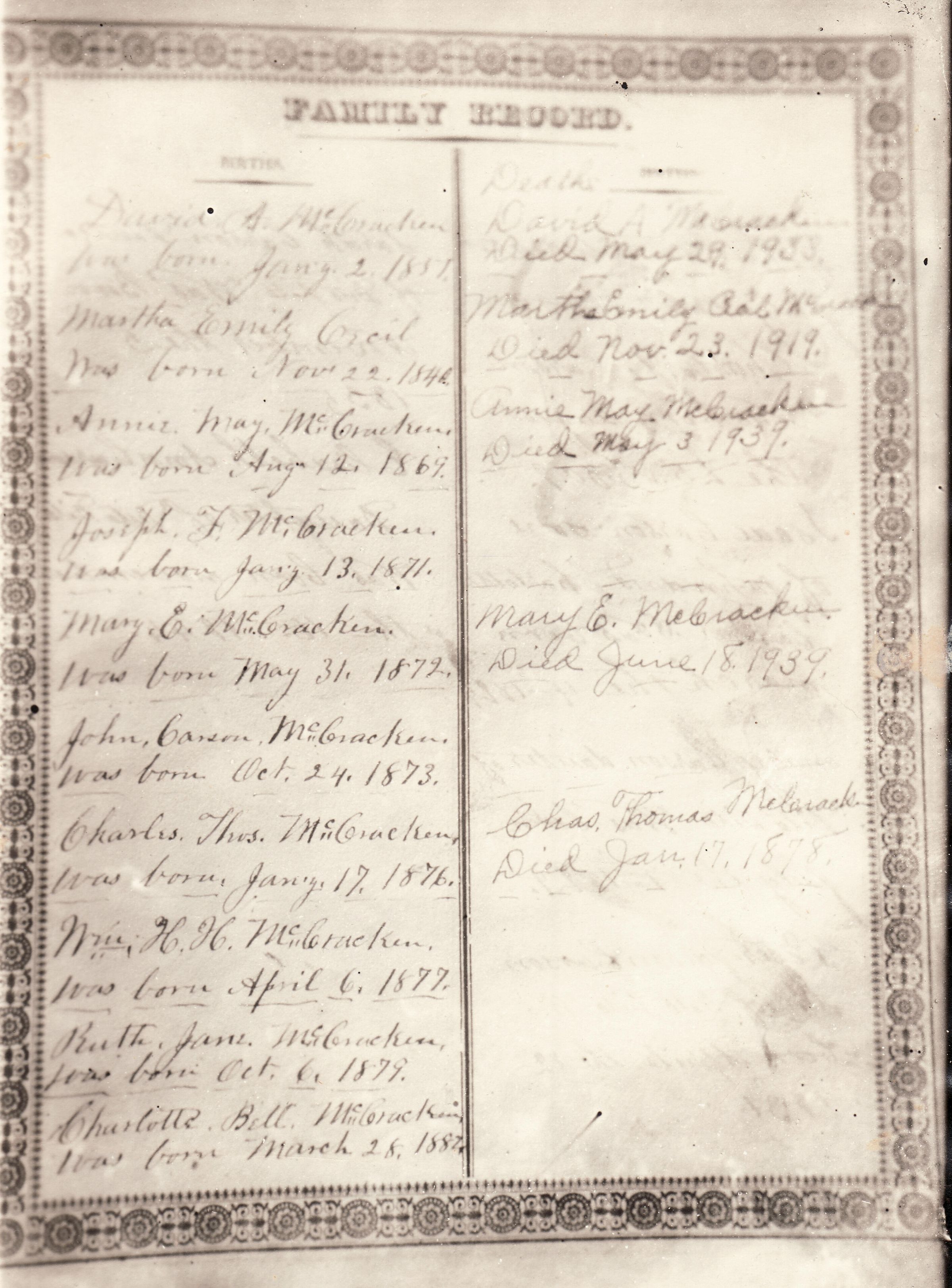 Source Citation: Photograph of a family data page from the David A. McCracken and Martha Emily (Cecil) McCracken Family Bible; item no. SCHE-AN005-0011, Thomas and Bertha (Staggers) Scherich Collection, shared by Eugene Scherich, Greene Connections: Greene County, Pennsylvania Archives Project (www.GreeneConnections.com).