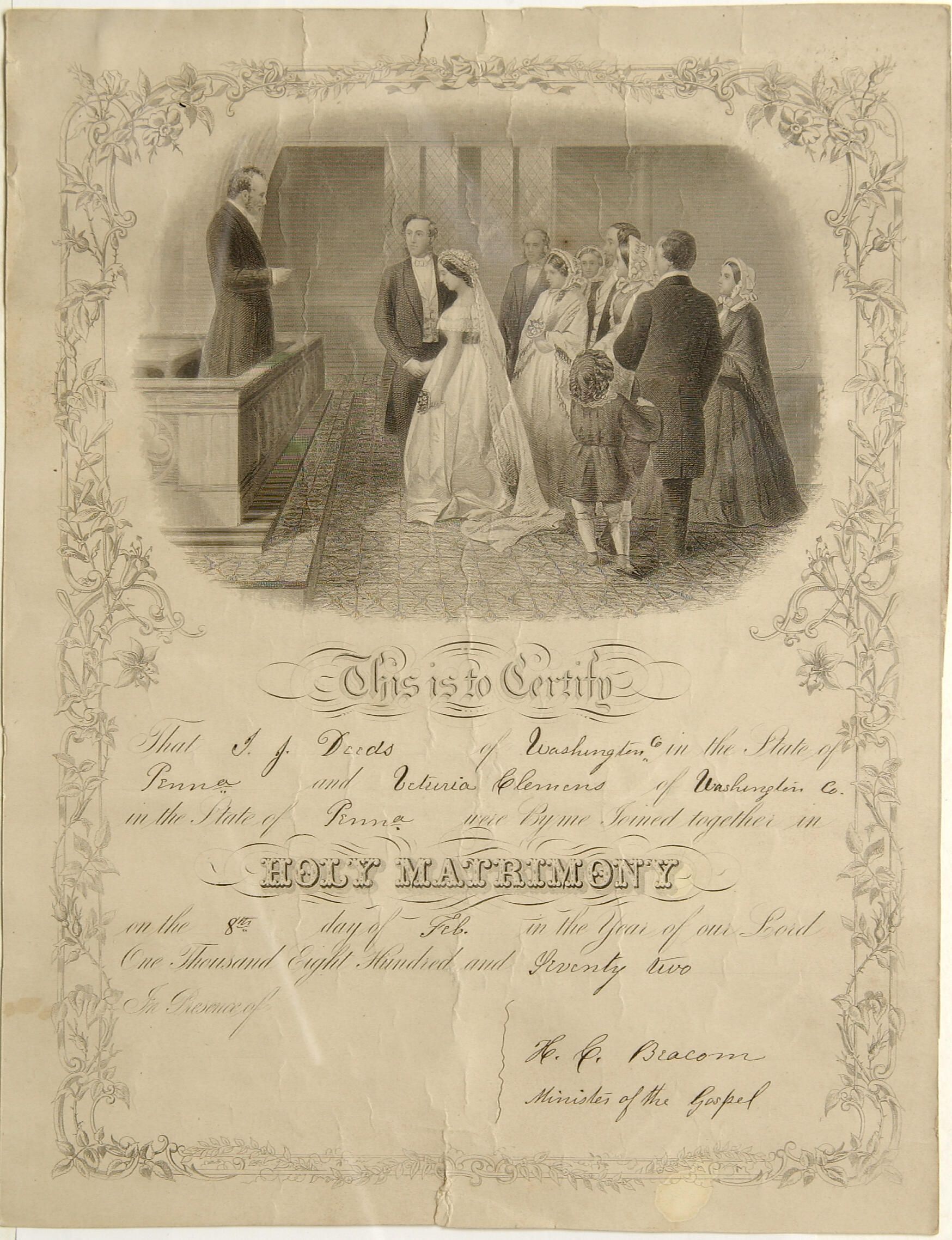 "This is to Certify / That I. J. Deeds of Washington Co. in the State of / Penna. and Veturia Clemens of Washington Co. / in the State of Penna. were By me Joined together in / Holy Matrimony / on the 8th day of Feb. in the Year of our Lord / One Thousand Eight Hundred and Seventy Two. / H. C. Beacom / Minister of the Gospel."