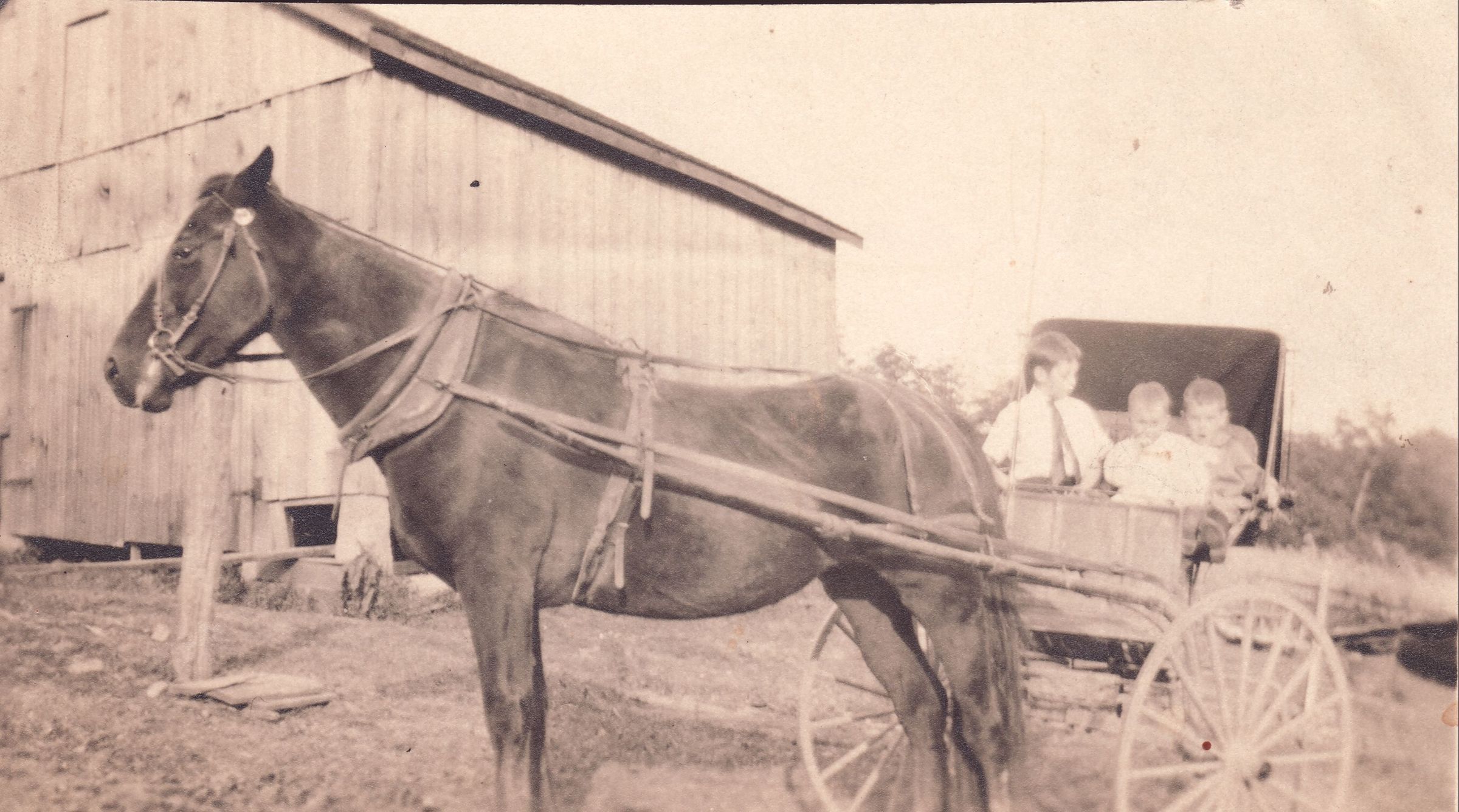 Source Citation: "Old Don" pulling the buggy loaded with the three Dinsmore brothers, item no. DINS-AN001-0016, Mary Jane (Dinsmore) Kent Collection, Greene Connections Archives Project (www.GreeneConnections.com).