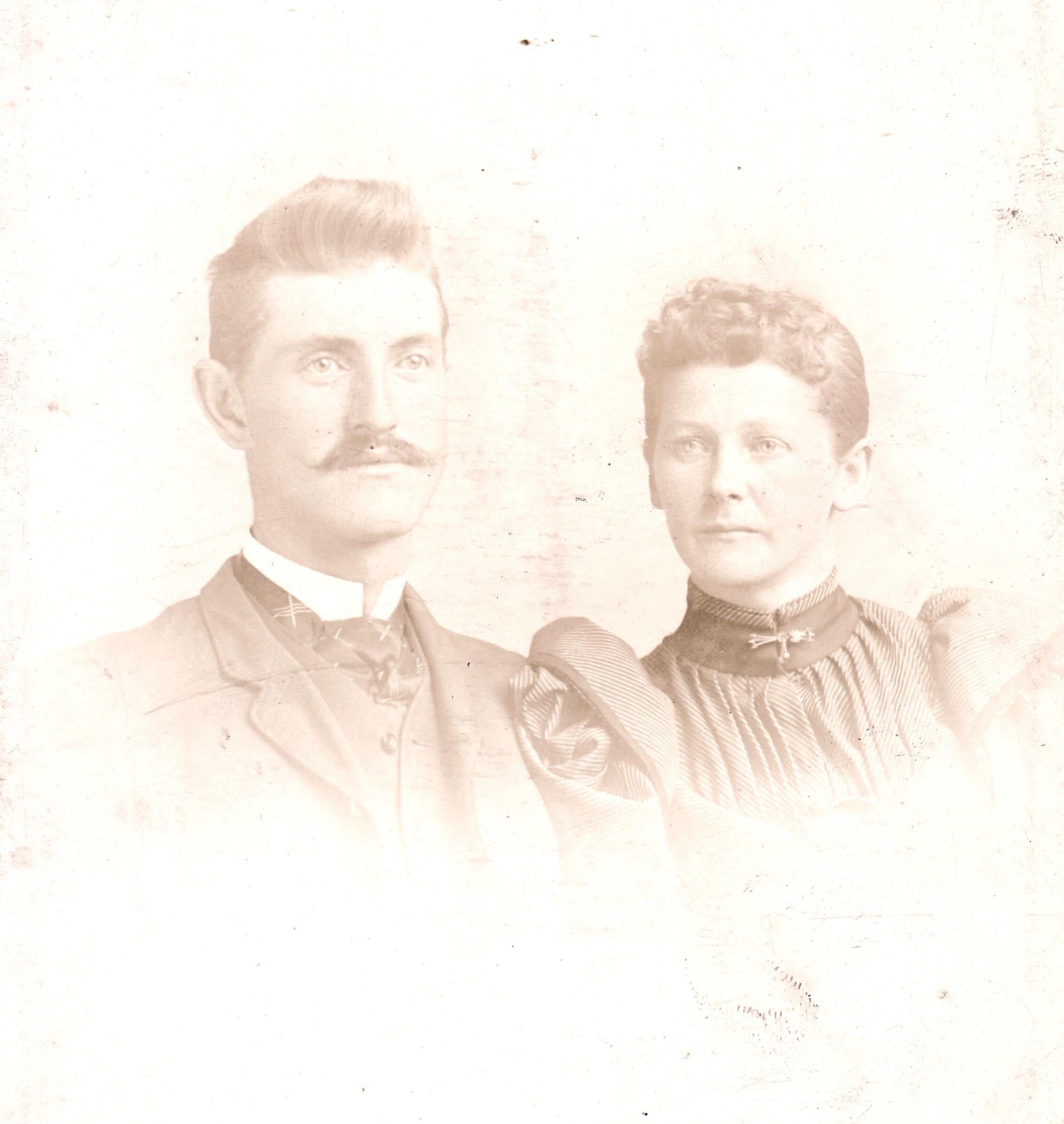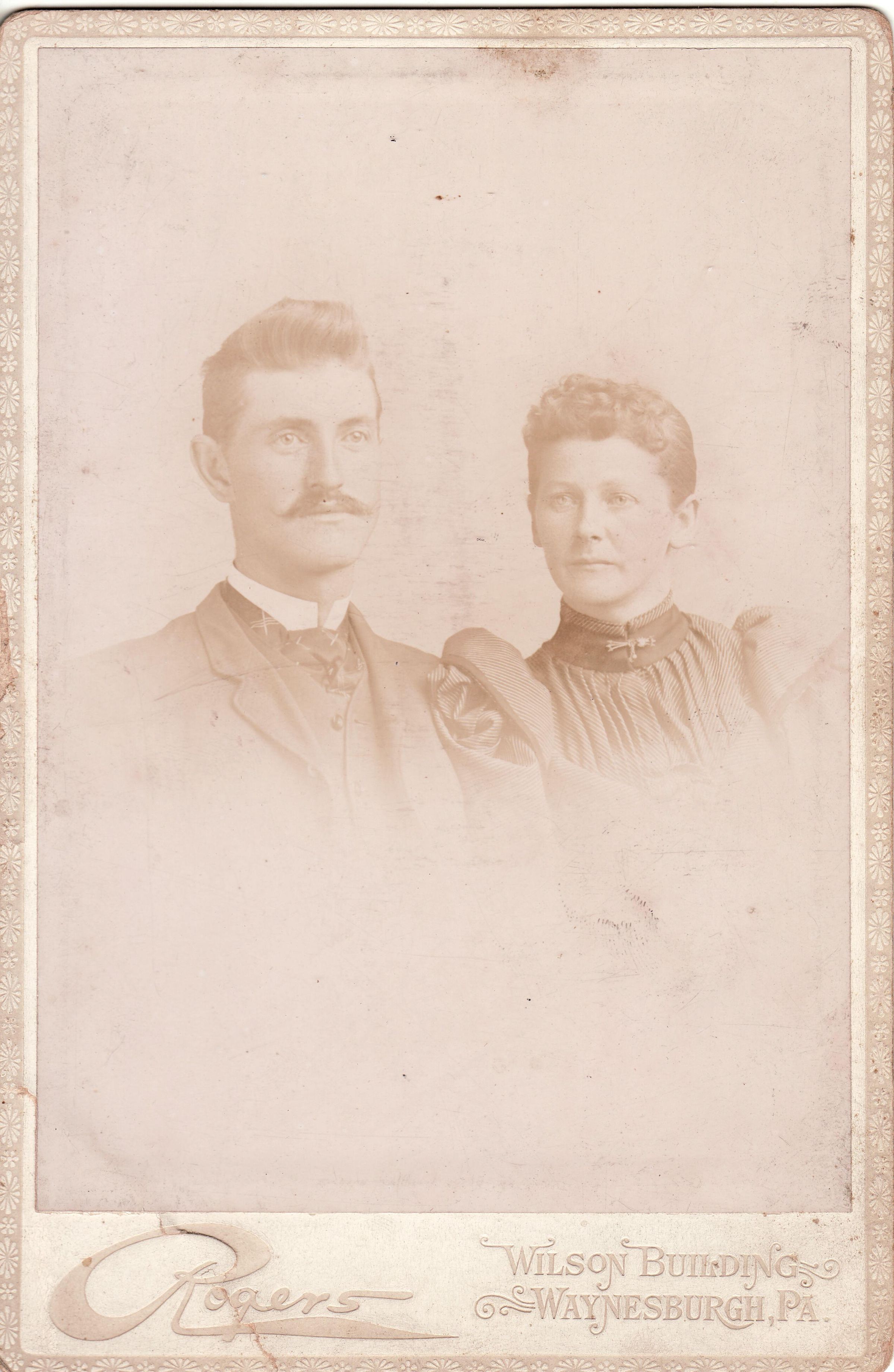 SOURCE CITATION: Doc Elzie Ruth [1866-1940] and his wife Elizabeth "Lib" (Supler) Ruth [1866-1947]; image by Rogers, Wilson Building, Waynesburgh, Pa., circa 1890-1900; item no. SUPL-AN002-0013, Supler Series, Wayne Carl Swart Collection, Greene Connections Archives Project (www.GreeneConnections.com).