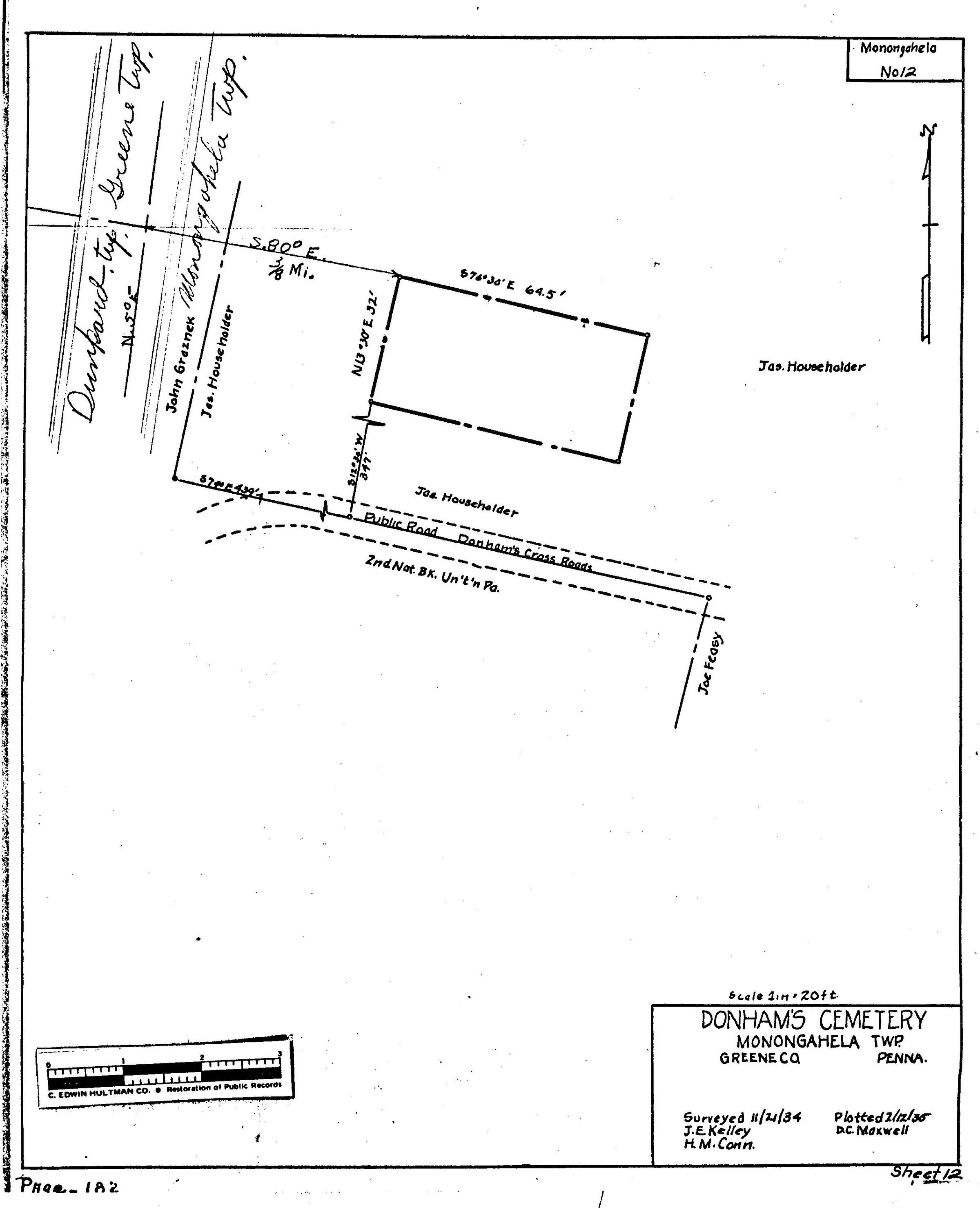 Source Citation: WPA Cemetery Plat - Pennsylvania - Greene County - Monongahela Township - Donham Cemetery (1934); item no. 2016.3.55, Cemetery Plat (WPA) Collection, surveyed by Works Projects Administration, copy on file at the Clerk of Courts Office, Greene County Courthouse; Greene Connections Archives Project (GreeneConnections.com).
