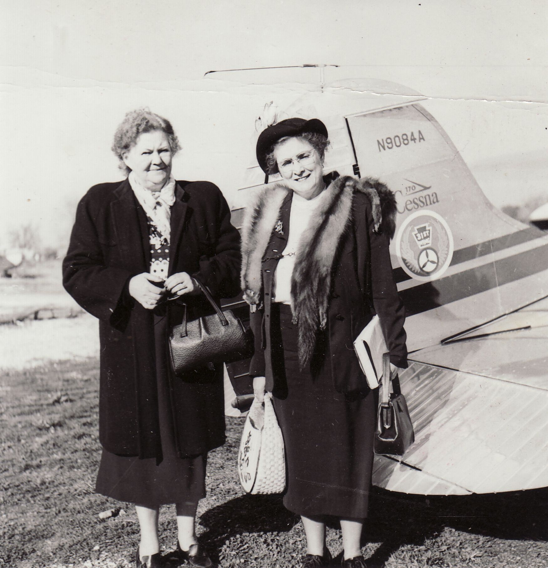 SOURCE CITATION: [Left-Right]: Mrs. Hemphill and Dorothy Simpson (Minor) Cary [1894-1969], standing in front of Emmett Foster Cary's airplane; circa 1960; item no. CARY-AN003-0005, Cary Series, Margaret Minor (Cary) Smith Collection; Greene Connections Archives Project (GreeneConnections.com).