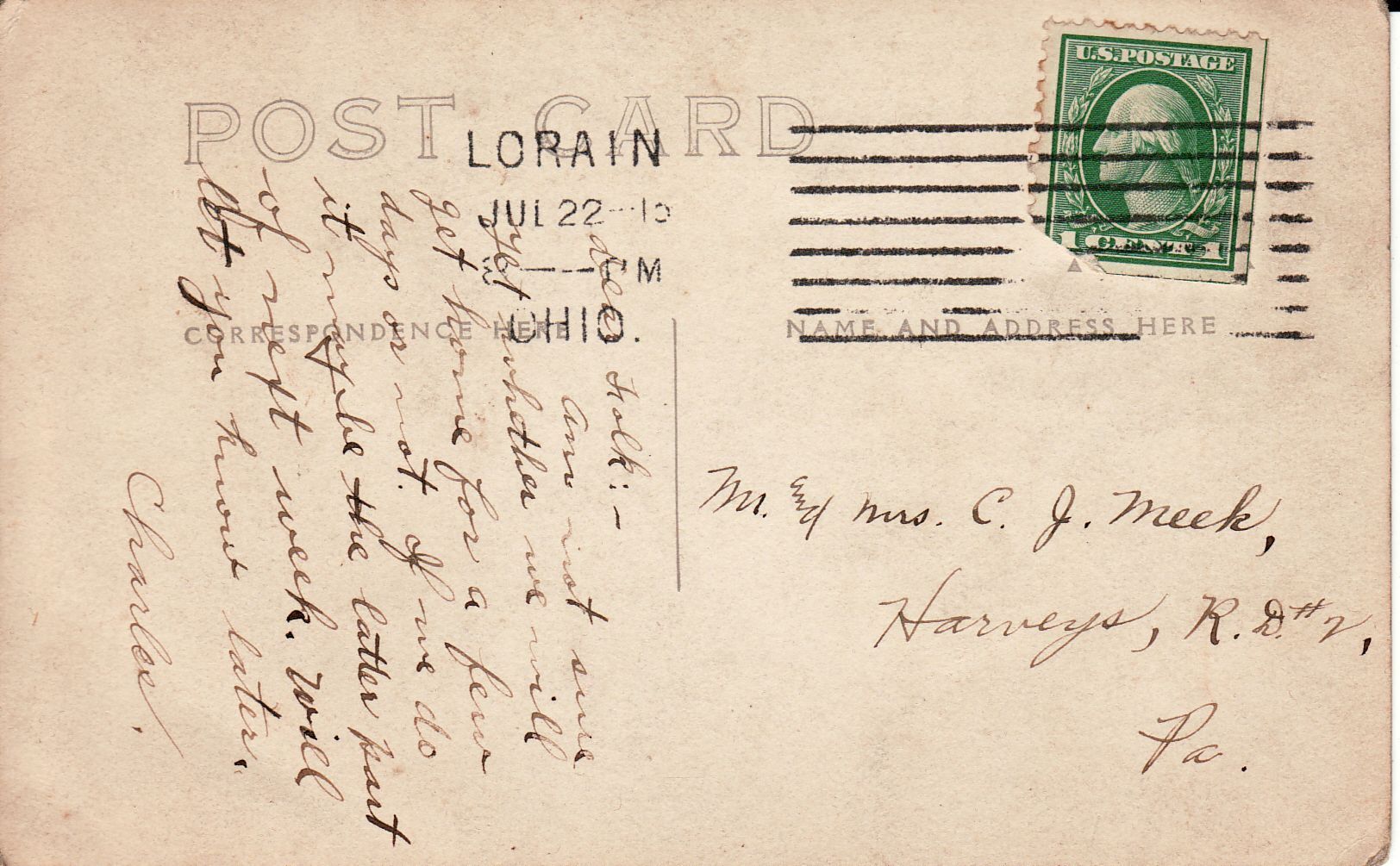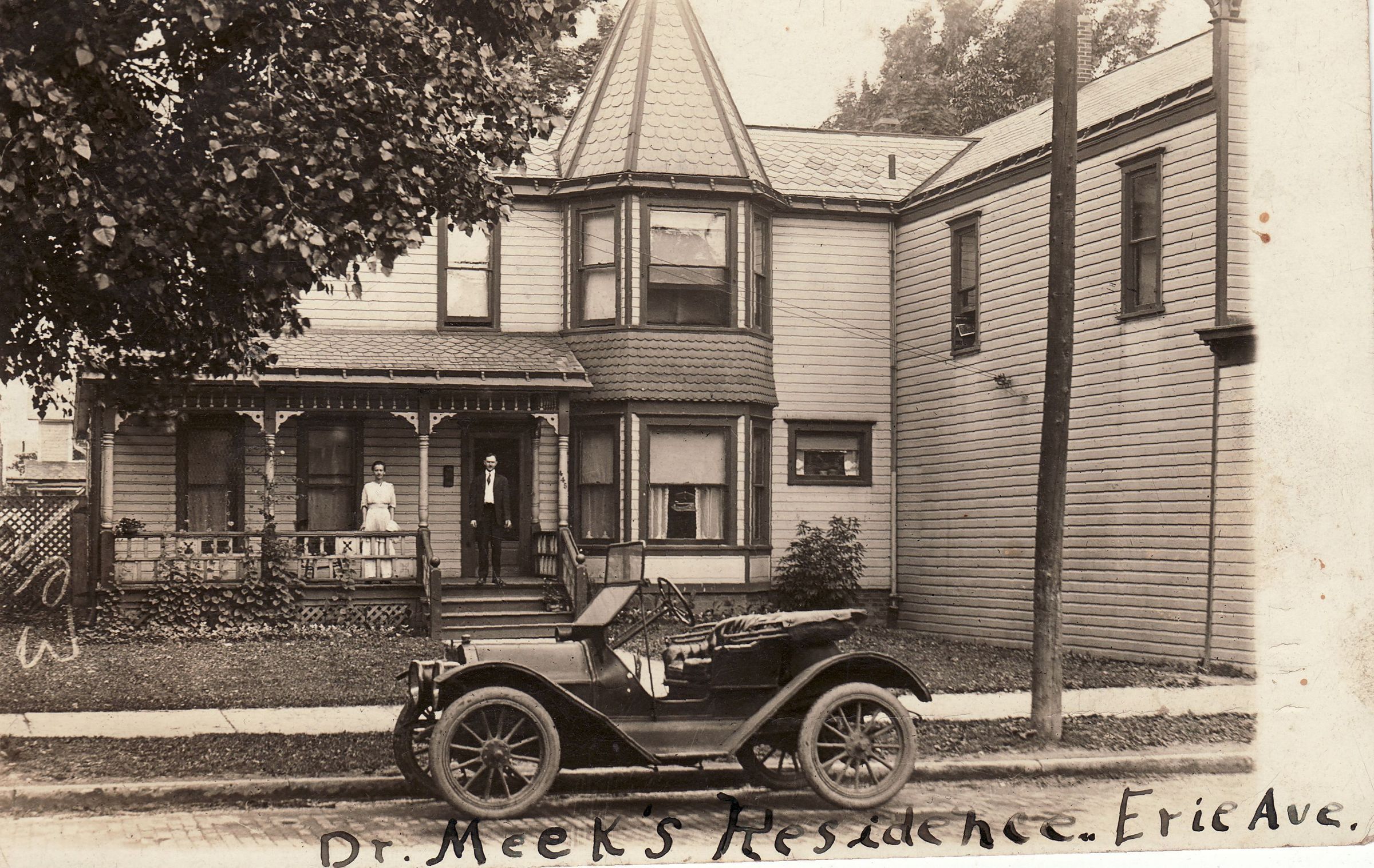 SOURCE CITATION: Dr. Charles Roscoe Meek and Nettie (Waychoff) Meek in front of their home on Erie Avenue in Lorain, Lorain County, Ohio; postmarked 22 July 1915; item no. CARP-AN006-0017, Sellers Burdette and Bettie (Blake) Carpenter Collection, shared by their heirs; Greene Connections Archives Project (GreeneConnections.com).