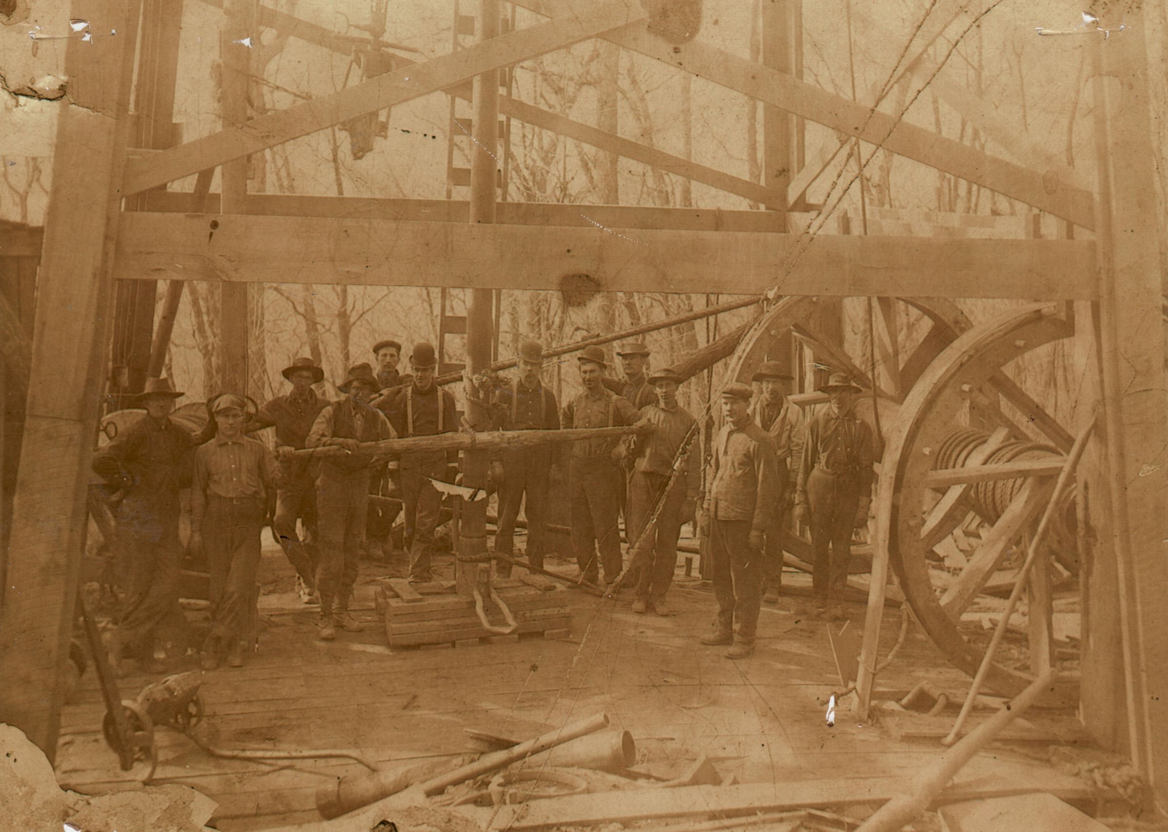Source Citation: Drilling a gas well with a wooden derrick in Kuhntown, Wayne Township, Greene County, Pennsylvania, item no. COLE-AN004-0002-0002, Occupations Series, Terry Cole Collection, Greene Connections Archives Project (www.GreeneConnections.com).
