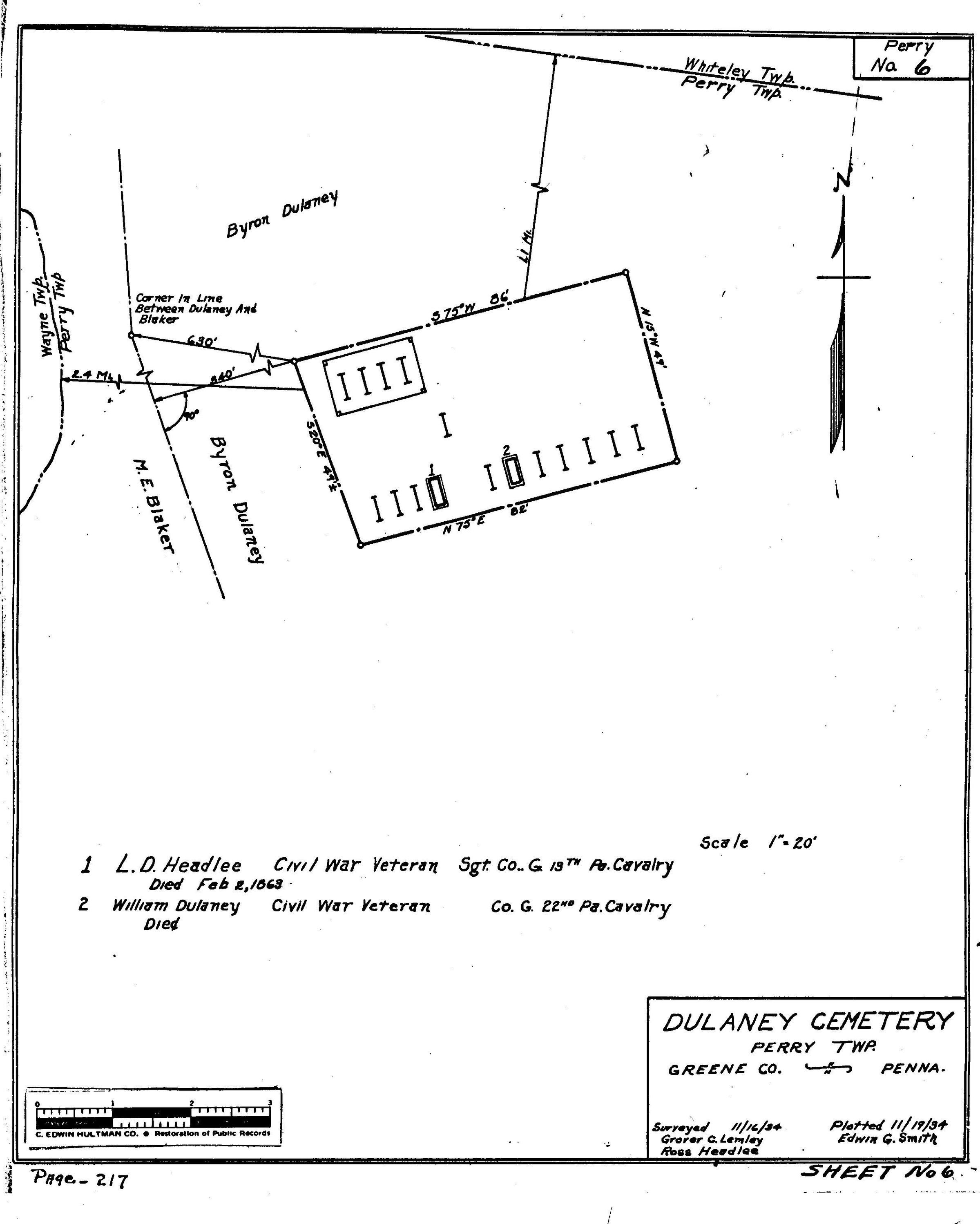 SOURCE CITATION: WPA Cemetery Plat - Pennsylvania - Greene County - Perry Township - Dulaney Cemetery (1934), item no. 2016.3.74, Cemetery Plat (WPA) Collection, surveyed by Works Projects Administration, copy on file at the Clerk of Courts Office, Greene County Courthouse, Greene Connections Archives Project (www.GreeneConnections.com).