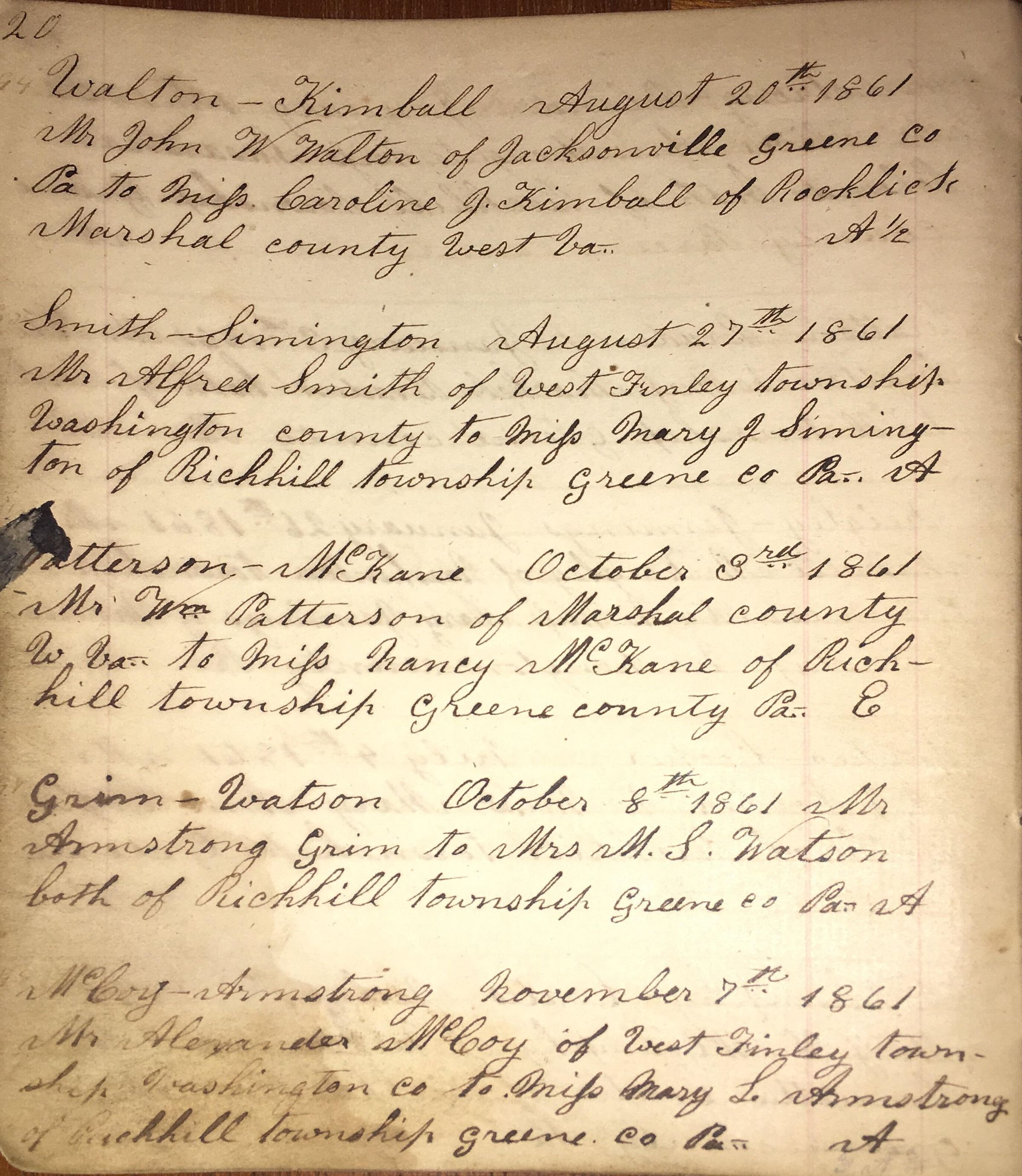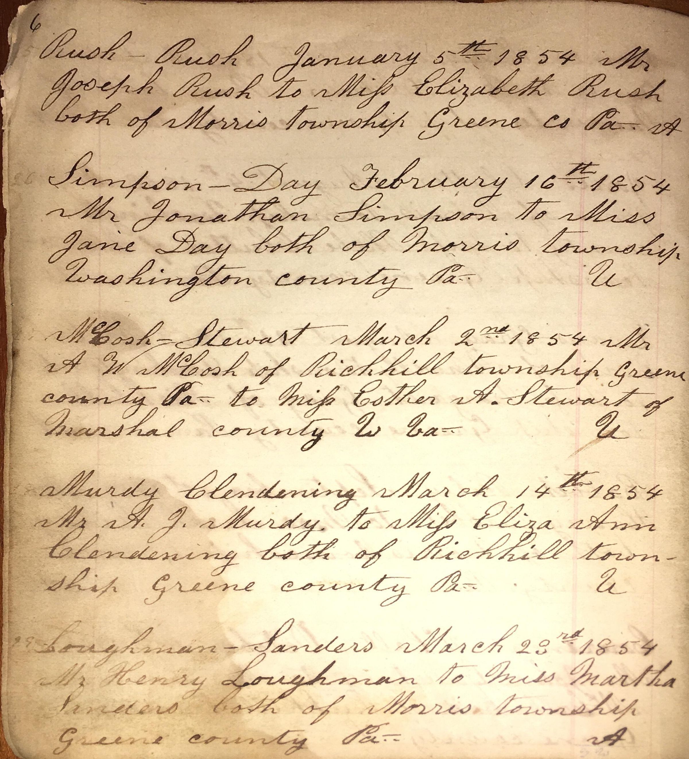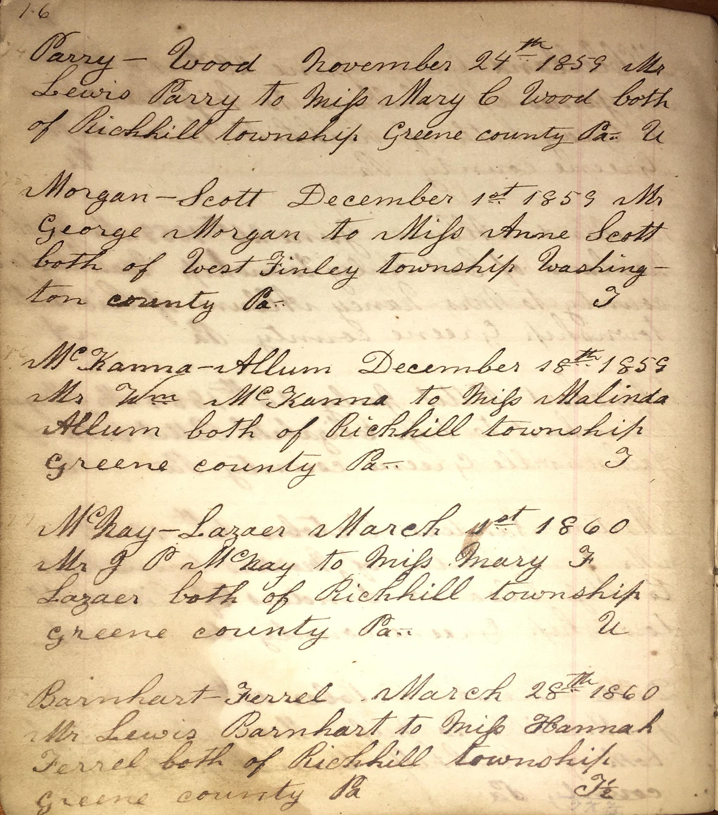 Rev. Luther Axtell Marriage Record Ledger, 1840s-1880s, representing Western Pennsylvania and West Virginia. Purchased via auction by Matt W. Cumberledge, Brave, Pennsylvania, 2016. Transcribed by virtual volunteers through the Greene Connections Archives crowdsourcing project, 2020-2021.
