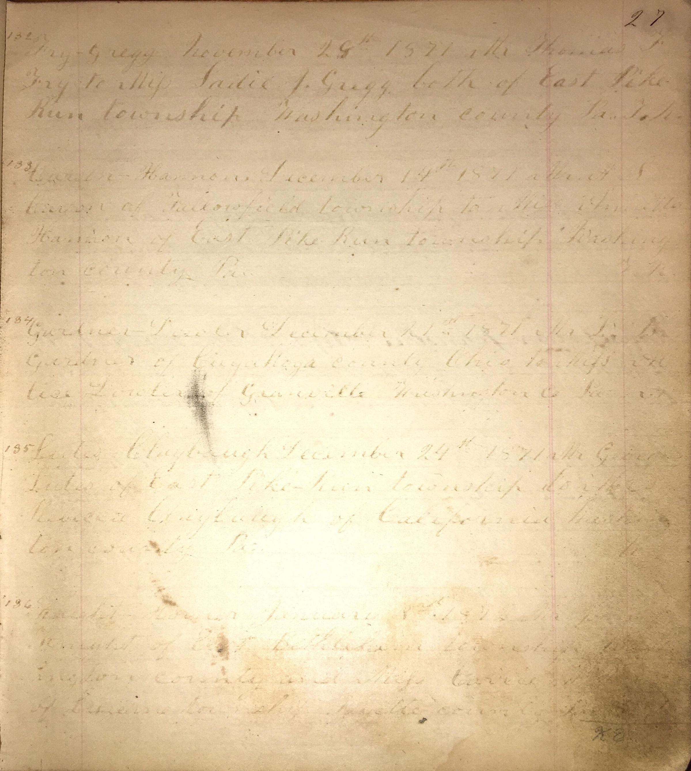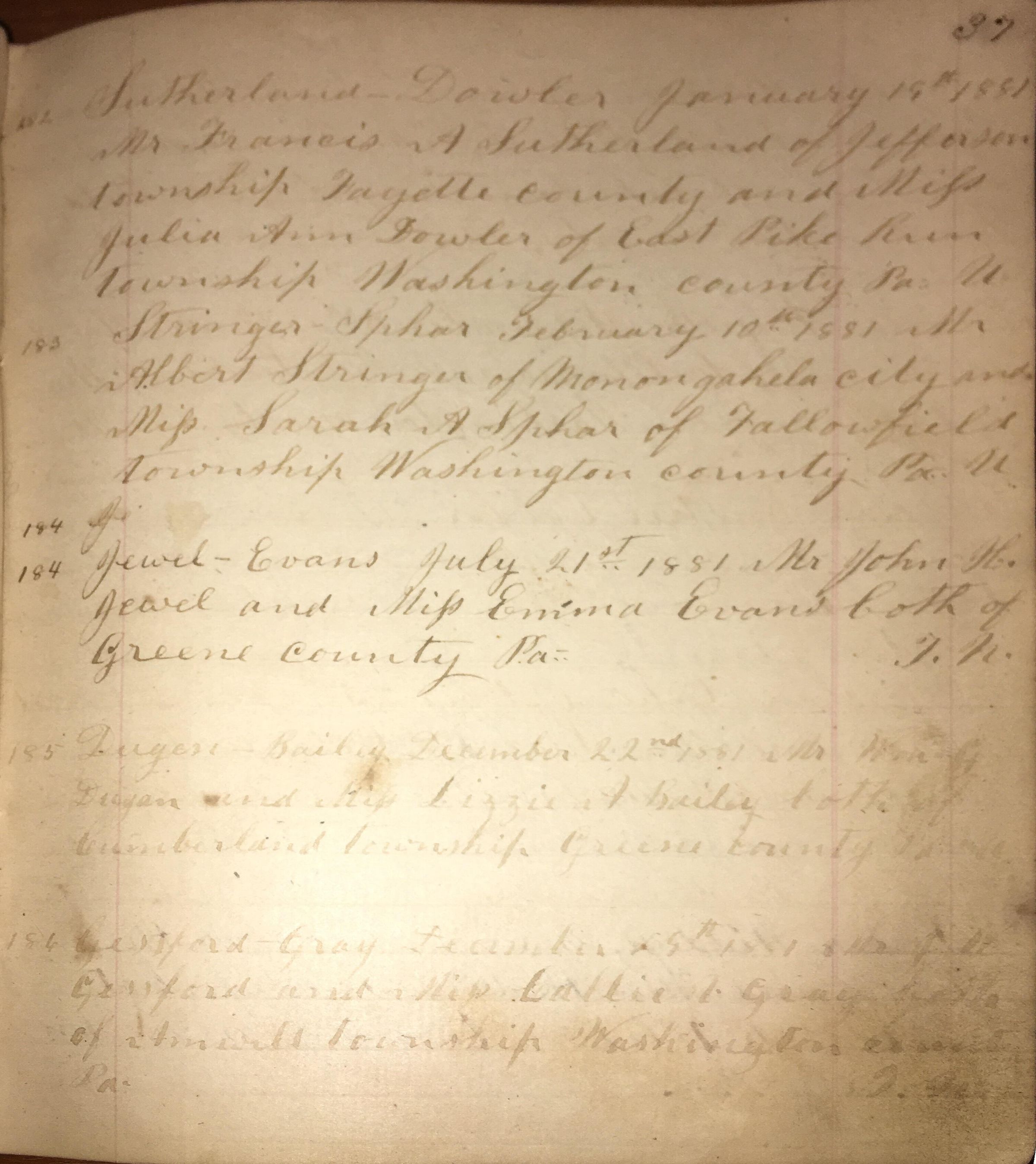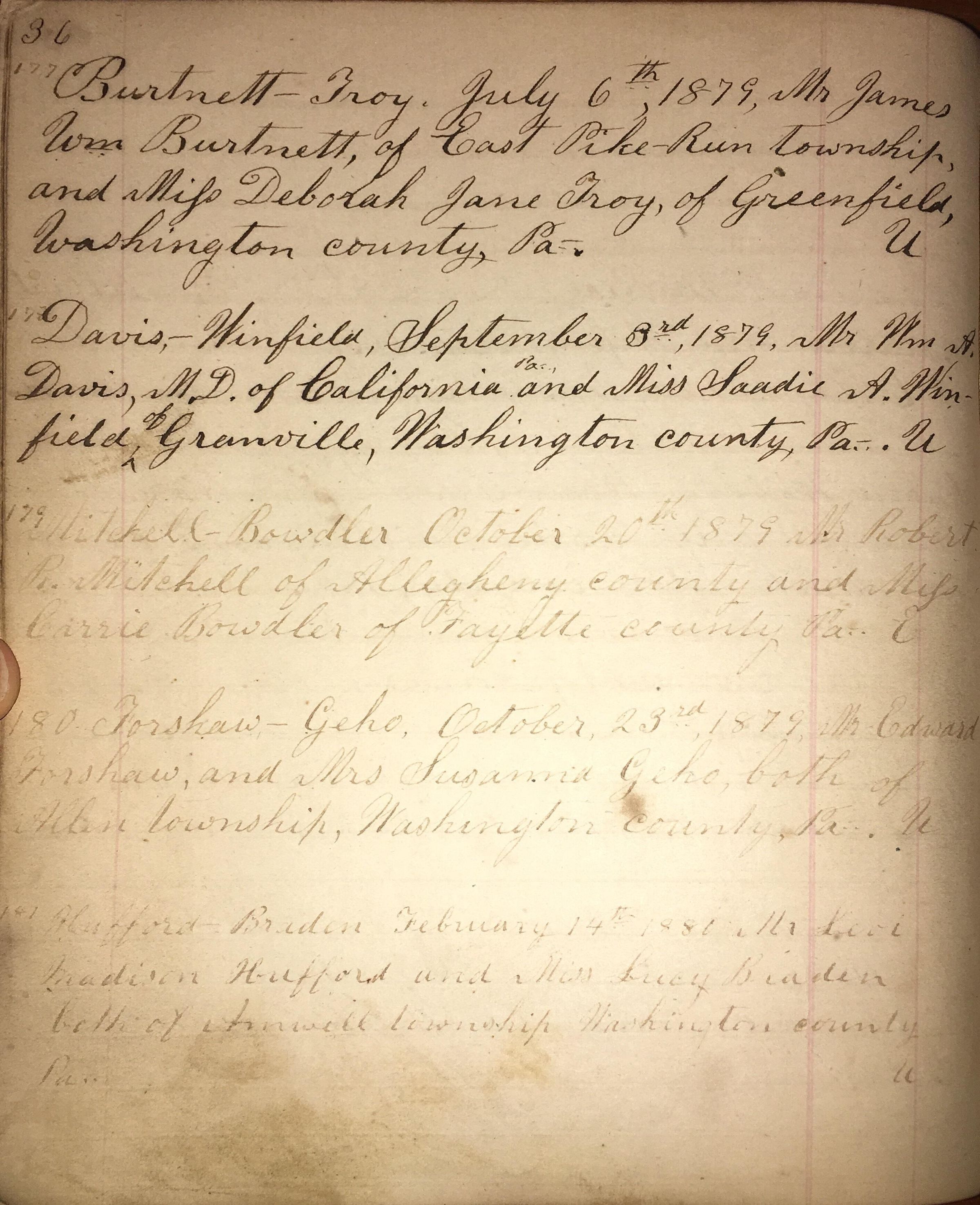 Rev. Luther Axtell Marriage Record Ledger, 1840s-1880s, representing Western Pennsylvania and West Virginia. Purchased via auction by Matt W. Cumberledge, Brave, Pennsylvania, 2016. Transcribed by virtual volunteers through the Greene Connections Archives crowdsourcing project, 2020-2021.