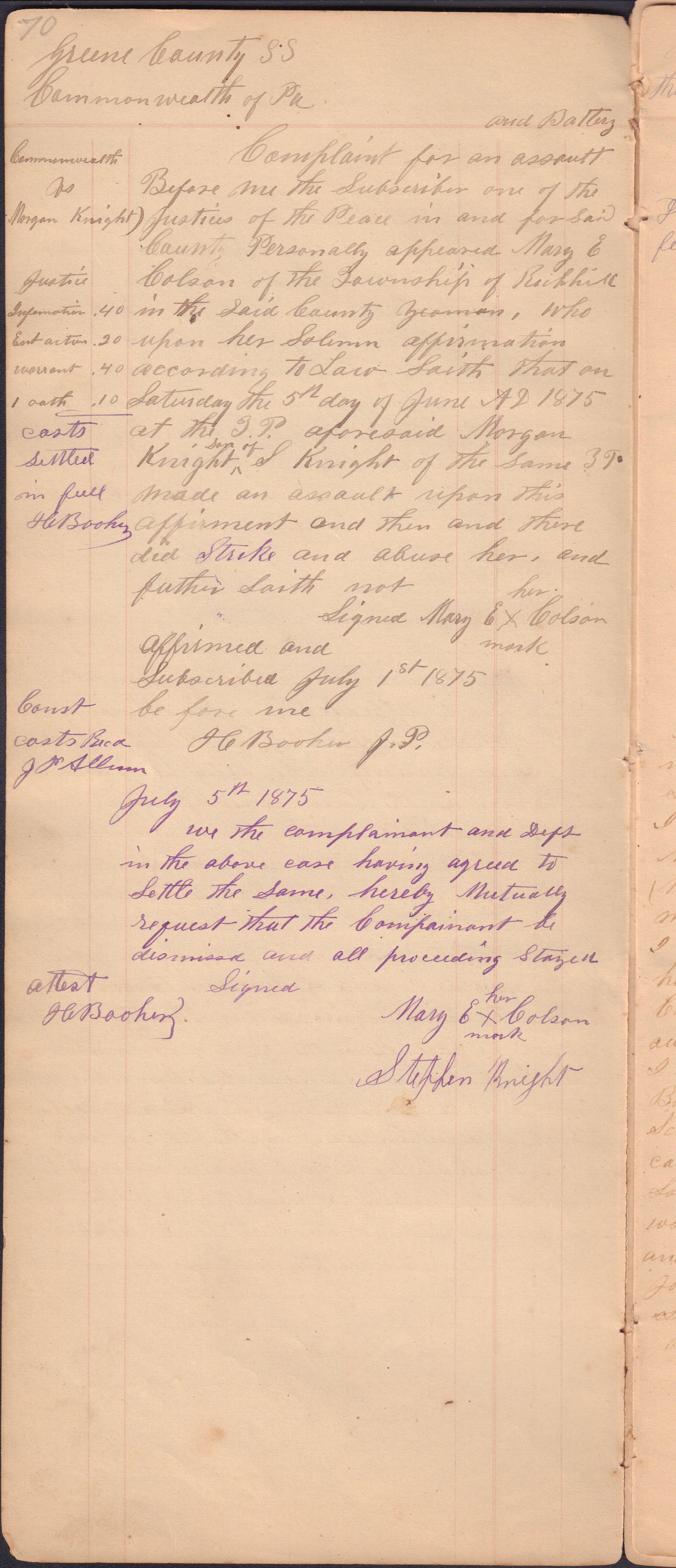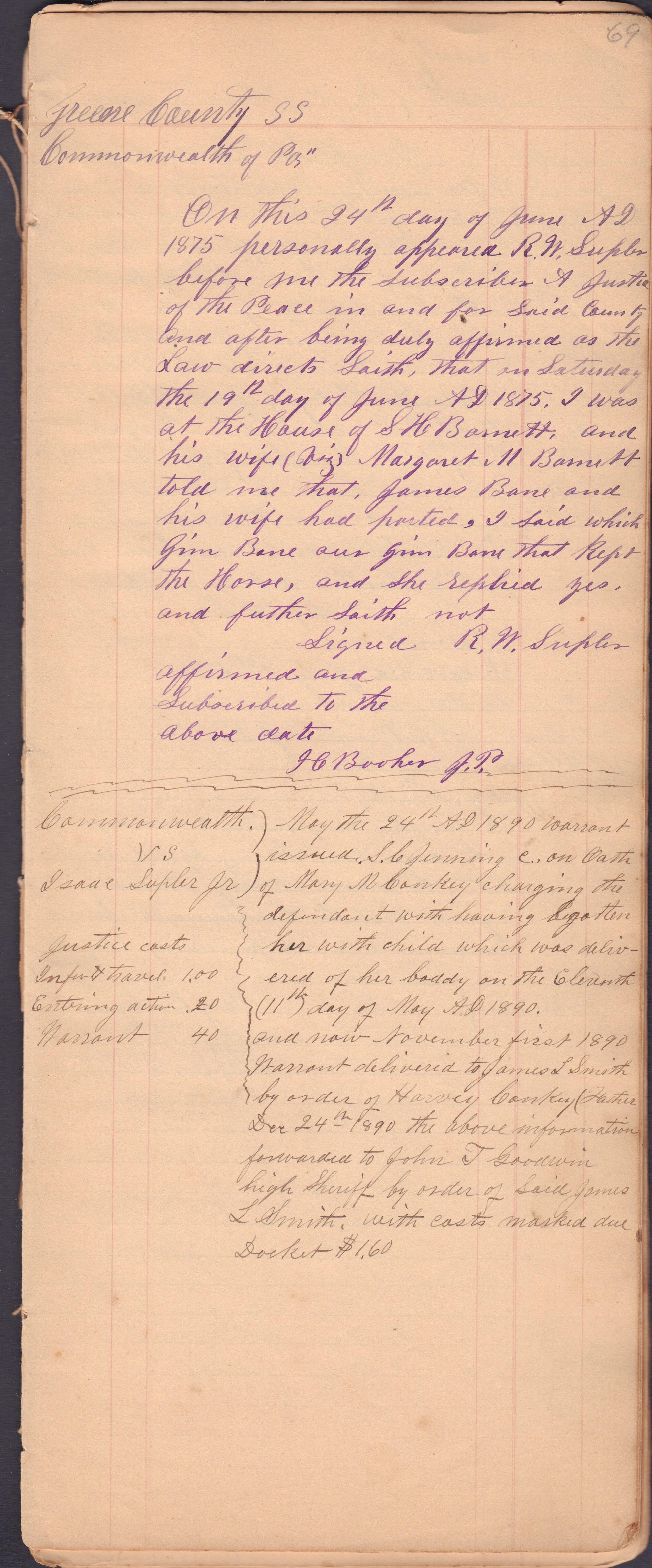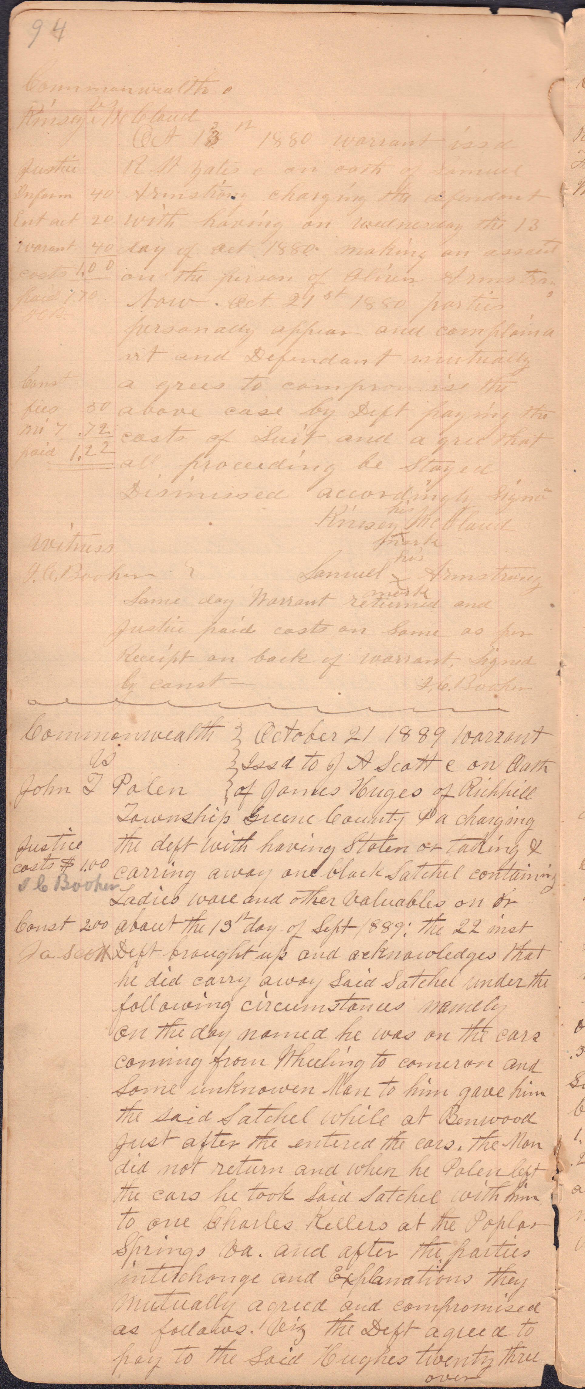 Source Citation: I. C. Booher and G. W. Smith, Justice of the Peace Docket, docket entries 1870s-1900s, Richhill Township, Greene County, Pennsylvania; held by Greene County Clerk of Court's Office, Courthouse, Waynesburg, Pennsylvania, 2016, item no. GCCH-AN003-0003-0000, Greene County Courthouse Collection, Greene Connections Archives Project (www.GreeneConnections.com).