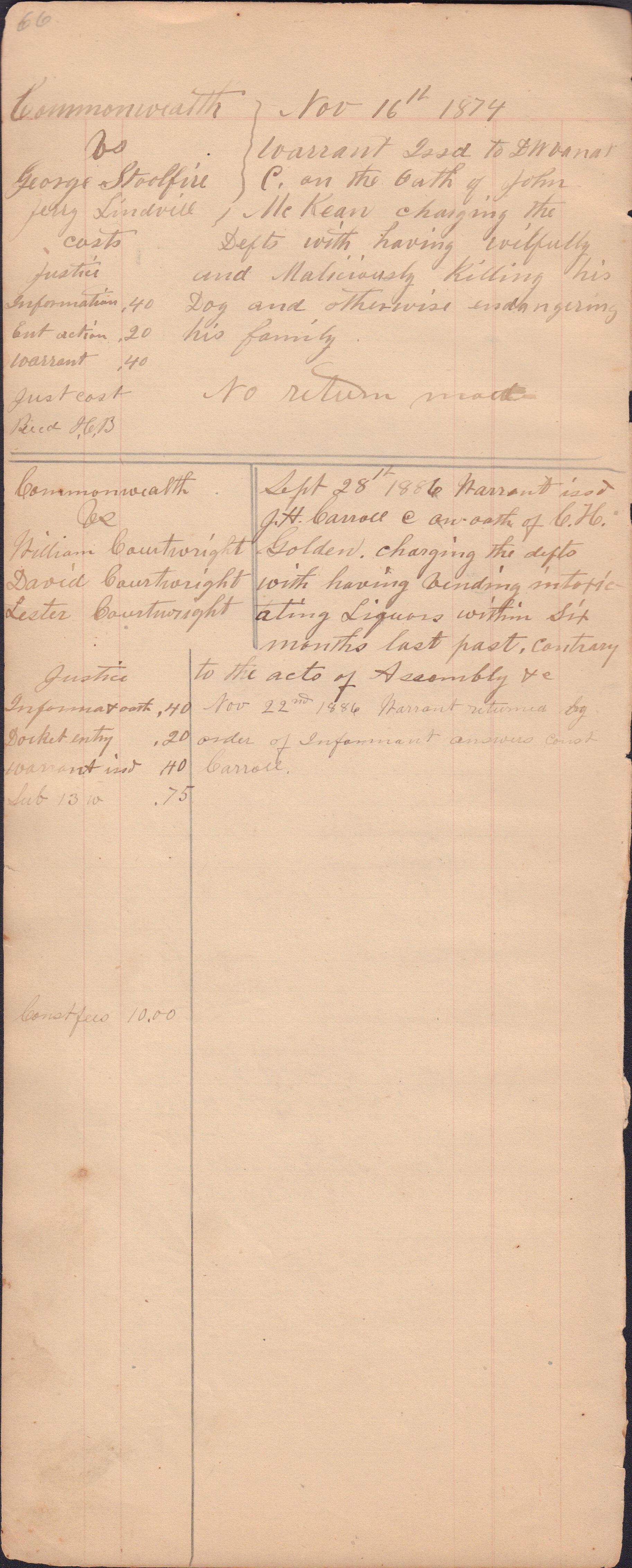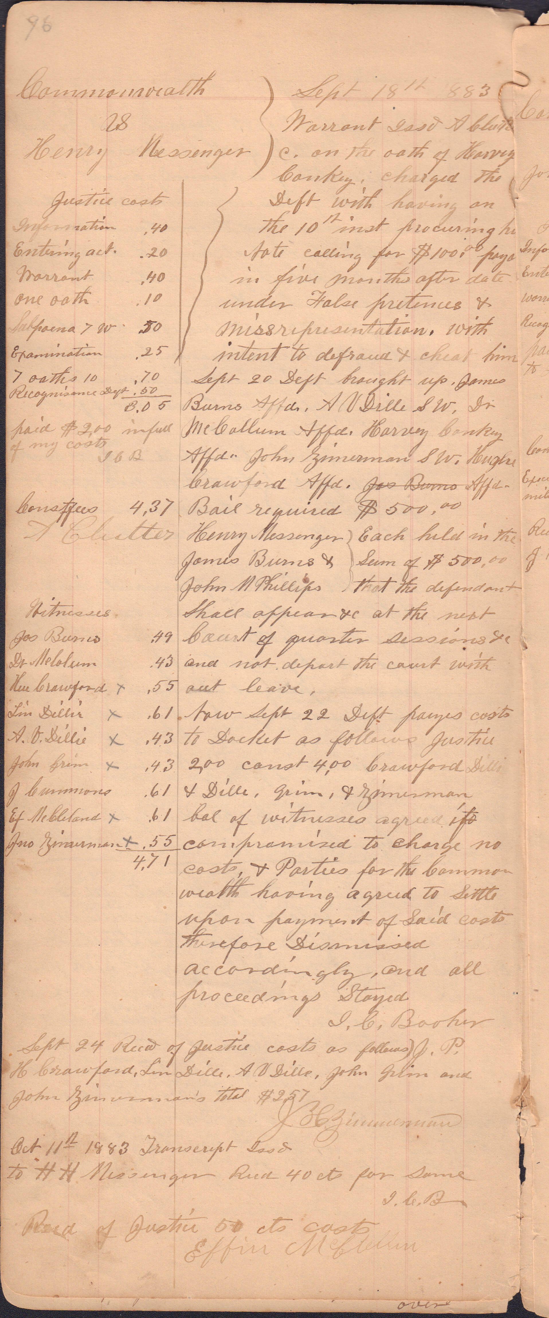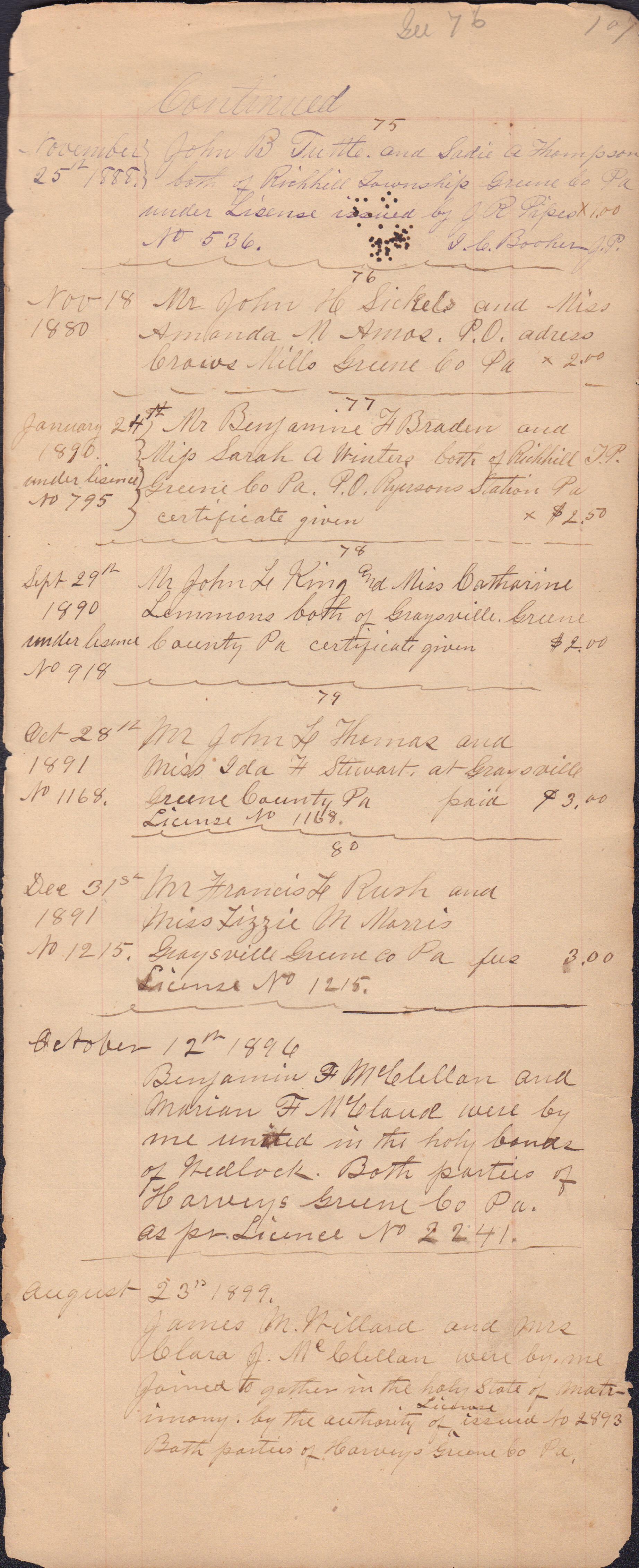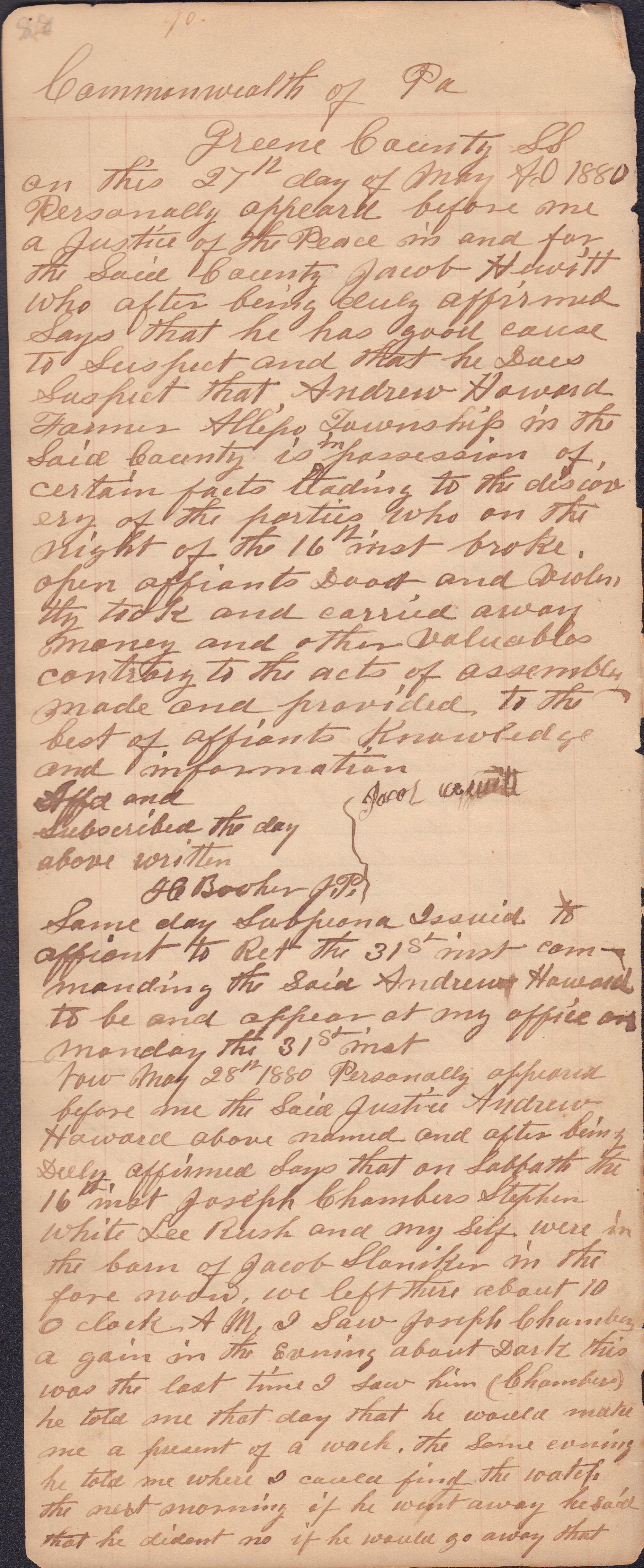 Source Citation: I. C. Booher and G. W. Smith, Justice of the Peace Docket, docket entries 1870s-1900s, Richhill Township, Greene County, Pennsylvania; held by Greene County Clerk of Court's Office, Courthouse, Waynesburg, Pennsylvania, 2016, item no. GCCH-AN003-0003-0000, Greene County Courthouse Collection, Greene Connections Archives Project (www.GreeneConnections.com).