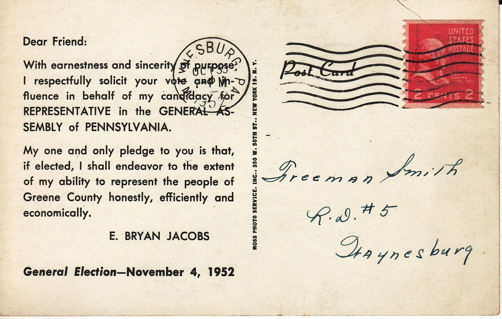 Source Citation: Dated 1952, Earl Bryan Jacobs [1908-1997], Political ad, item no. PALO-AN001-0002-0048, Jacobs Series, Sharon Roxane (Smith) Palone Collection, Greene Connections Archives Project (www.GreeneConnections.com).