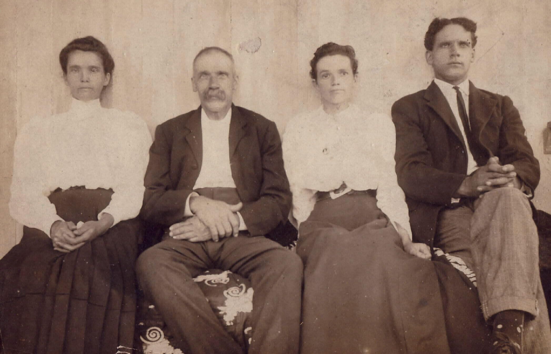 William Henry Bowler and his children, pictured [Left-Right]: Ocie Ella (Bowler) Buchanan, William Henry Bowler, Margaret (Bowler) Adamson, Henry Bowler.