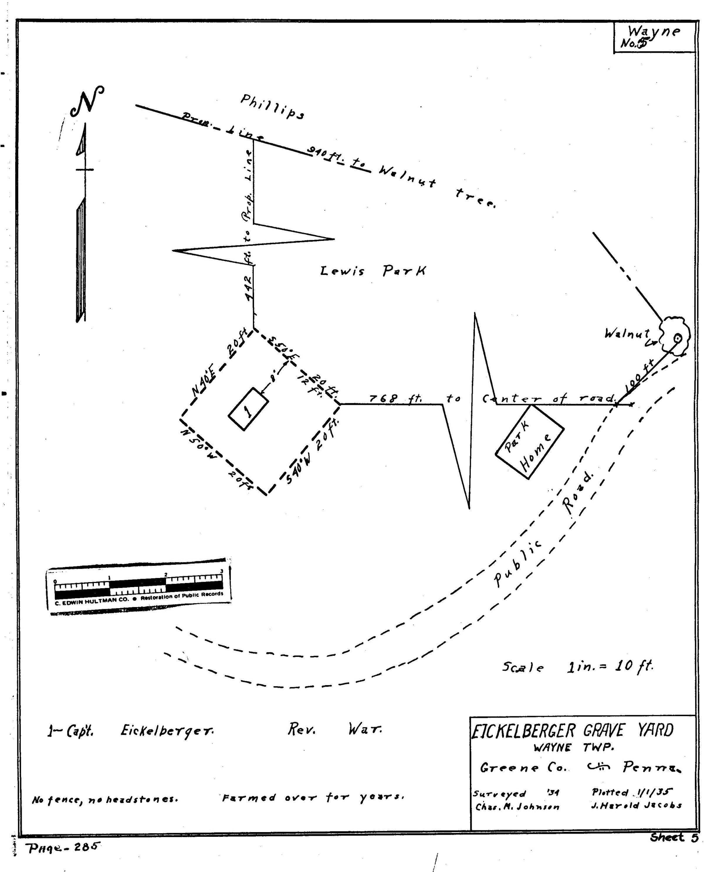 SOURCE CITATION: WPA Cemetery Plat - Pennsylvania - Greene County - Wayne Township - Eikelberger Cemetery (a/k/a Eichelberger or Eichelberry) (1934); item no. 2016.3.274, Cemetery Plat (WPA) Collection, surveyed by Works Projects Administration, copy on file at the Clerk of Courts Office, Greene County Courthouse; Greene Connections Archives Project (GreeneConnections.com).