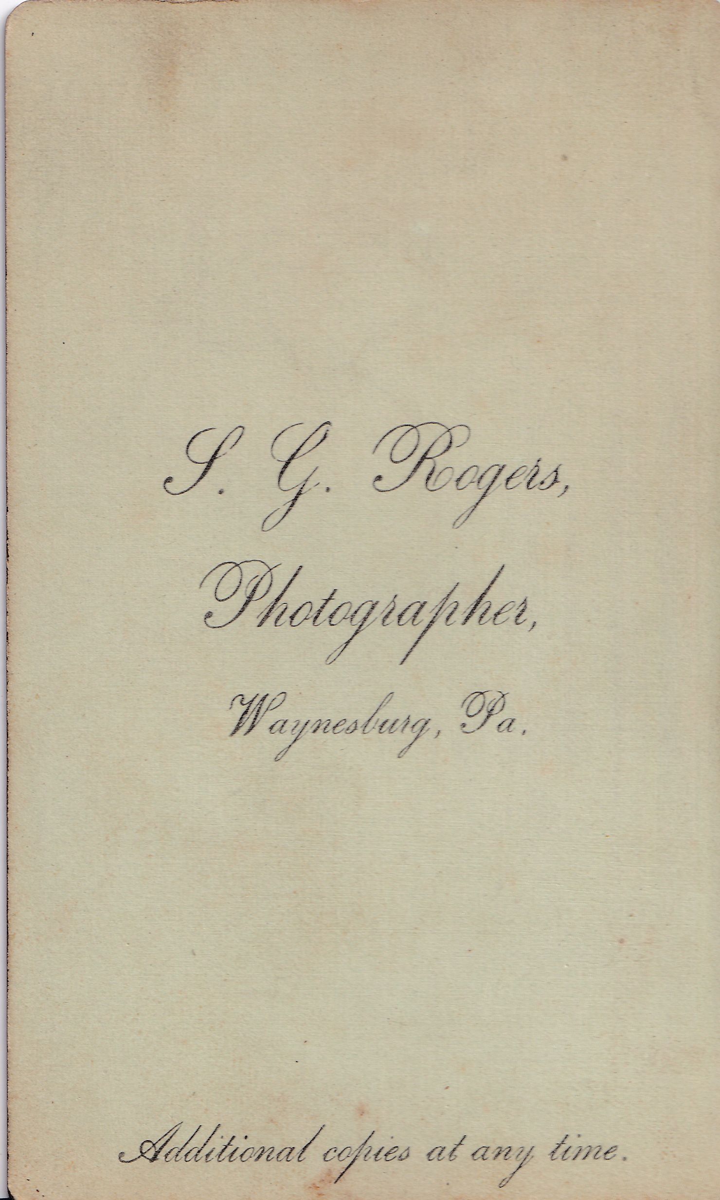 SOURCE CITATION: Eleanor (Morris) Linskea Album, Photo 01; circa 1870-1890, image by S. G. Rogers, Waynesburg, Pa.; item no. MORK-AN001-0001-0001, Elizabeth Jane (Davis) (Rex) Morris Collection, shared by her grandchildren, John Robert Morris and Kathleen (Morris) Miller; Greene Connections Archives Project (www.GreeneConnections.com).