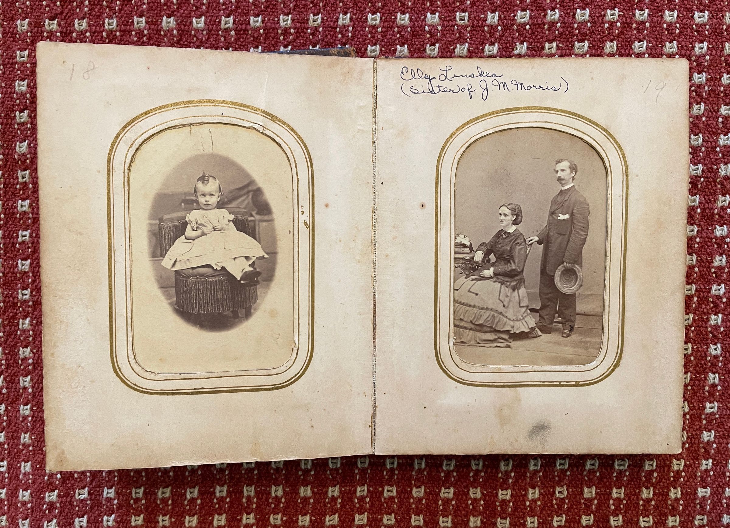 The Eleanor (Morris) Linskea Album originally belonged to Eleanor (Morris) Linskea [1835-1889], wife of John B. Linskea, daughter of John Morris and Charlotte Nichols. The carte-de-visite size album is inscribed on the front cover with her name, "Elly A. Linskea." After Eleanor's death at Dixmont State Hospital in Kilbuck Township, Allegheny County, Pennsylvania, the album appears to have passed to her brother, Jonathan Morris Morris [1832-1915], whose descendants have maintained it as part of his family collection.