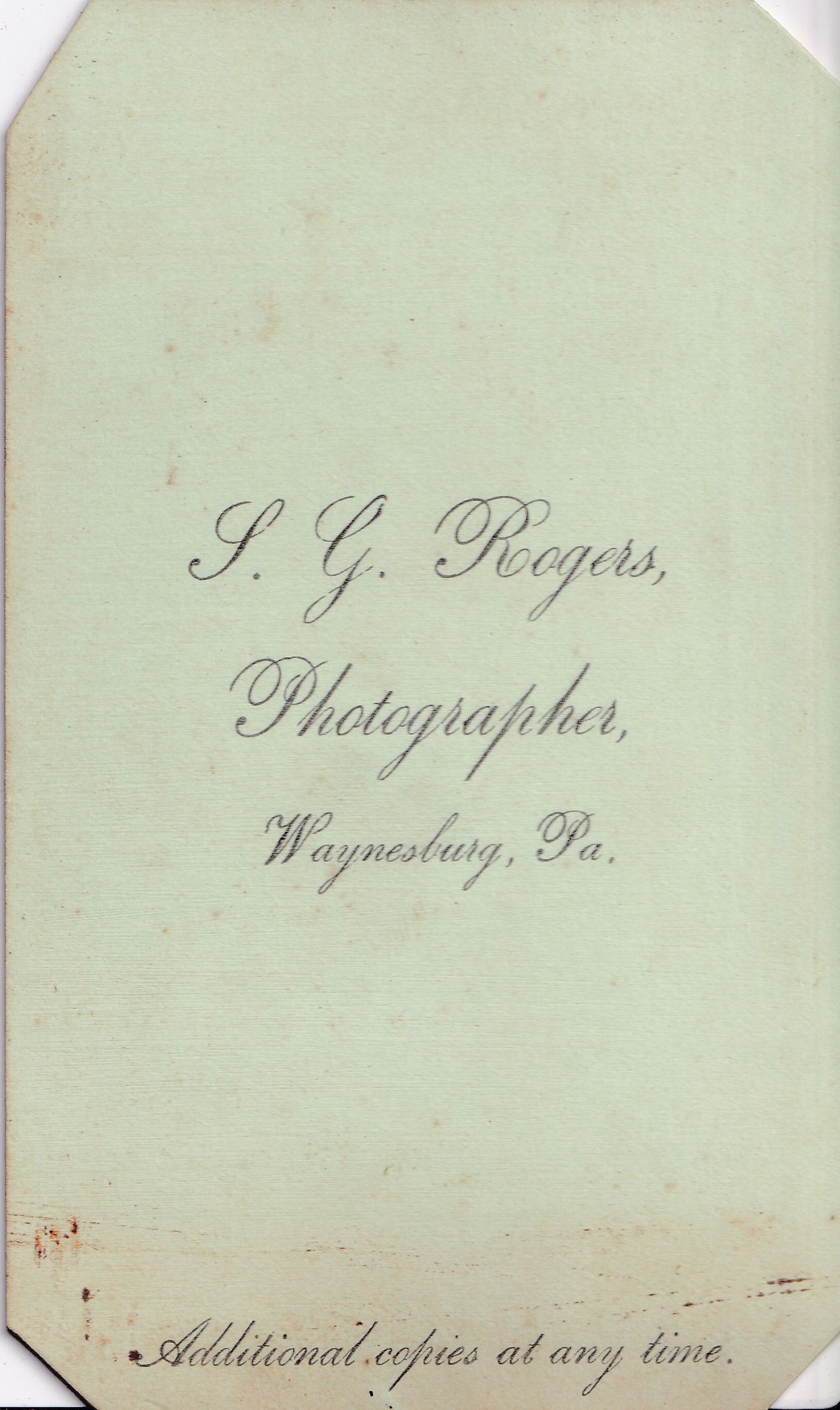 SOURCE CITATION: Eleanor (Morris) Linskea Album, Photo 26; circa 1870-1890, image by S. G. Rogers, Photographer, Waynesburg, Pa.; item no. MORK-AN001-0001-0026, Elizabeth Jane (Davis) (Rex) Morris Collection, shared by her grandchildren, John Robert Morris and Kathleen (Morris) Miller; Greene Connections Archives Project (www.GreeneConnections.com).
