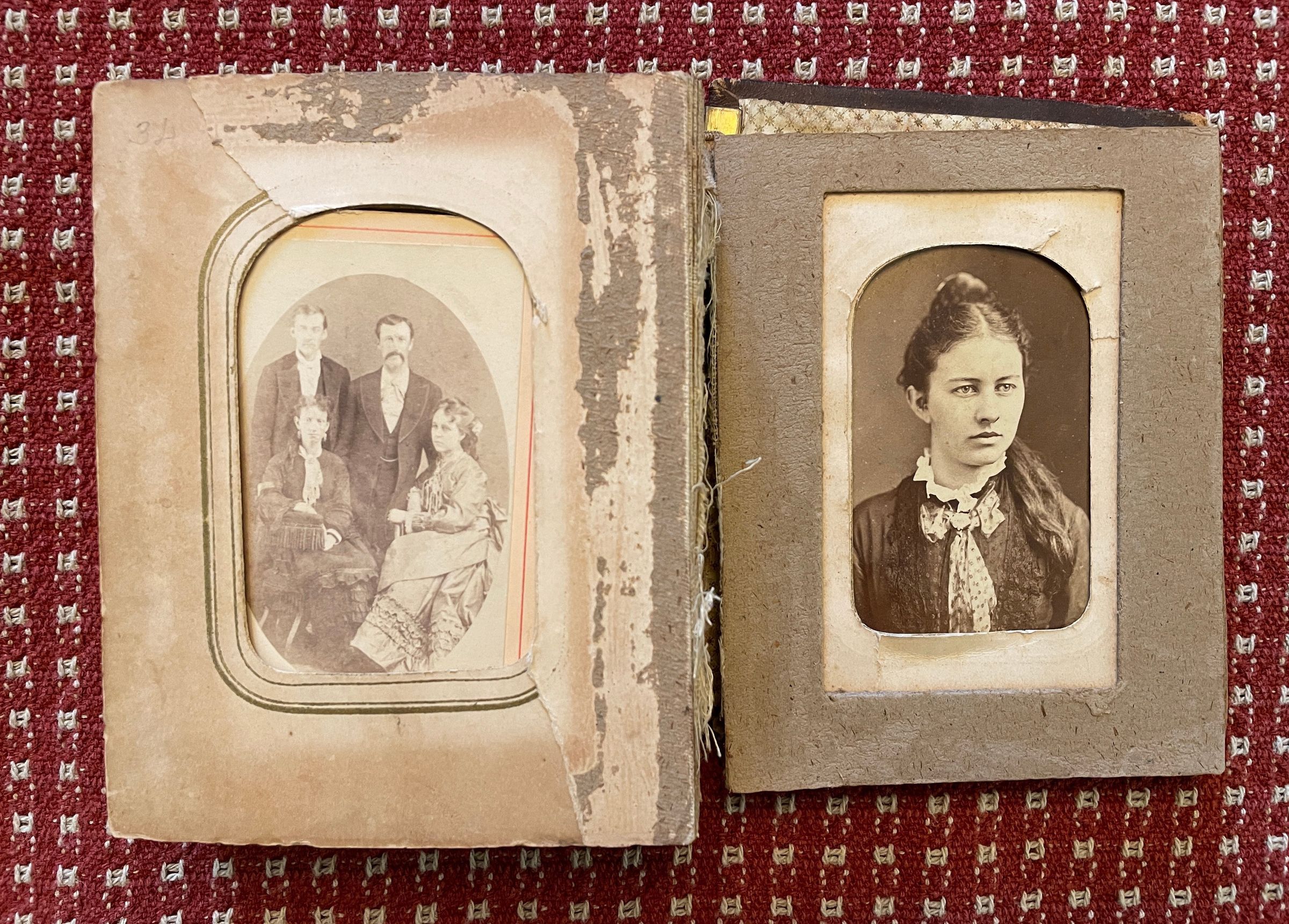 The Eleanor (Morris) Linskea Album originally belonged to Eleanor (Morris) Linskea [1835-1889], wife of John B. Linskea, daughter of John Morris and Charlotte Nichols. The carte-de-visite size album is inscribed on the front cover with her name, "Elly A. Linskea." After Eleanor's death at Dixmont State Hospital in Kilbuck Township, Allegheny County, Pennsylvania, the album appears to have passed to her brother, Jonathan Morris Morris [1832-1915], whose descendants have maintained it as part of his family collection.