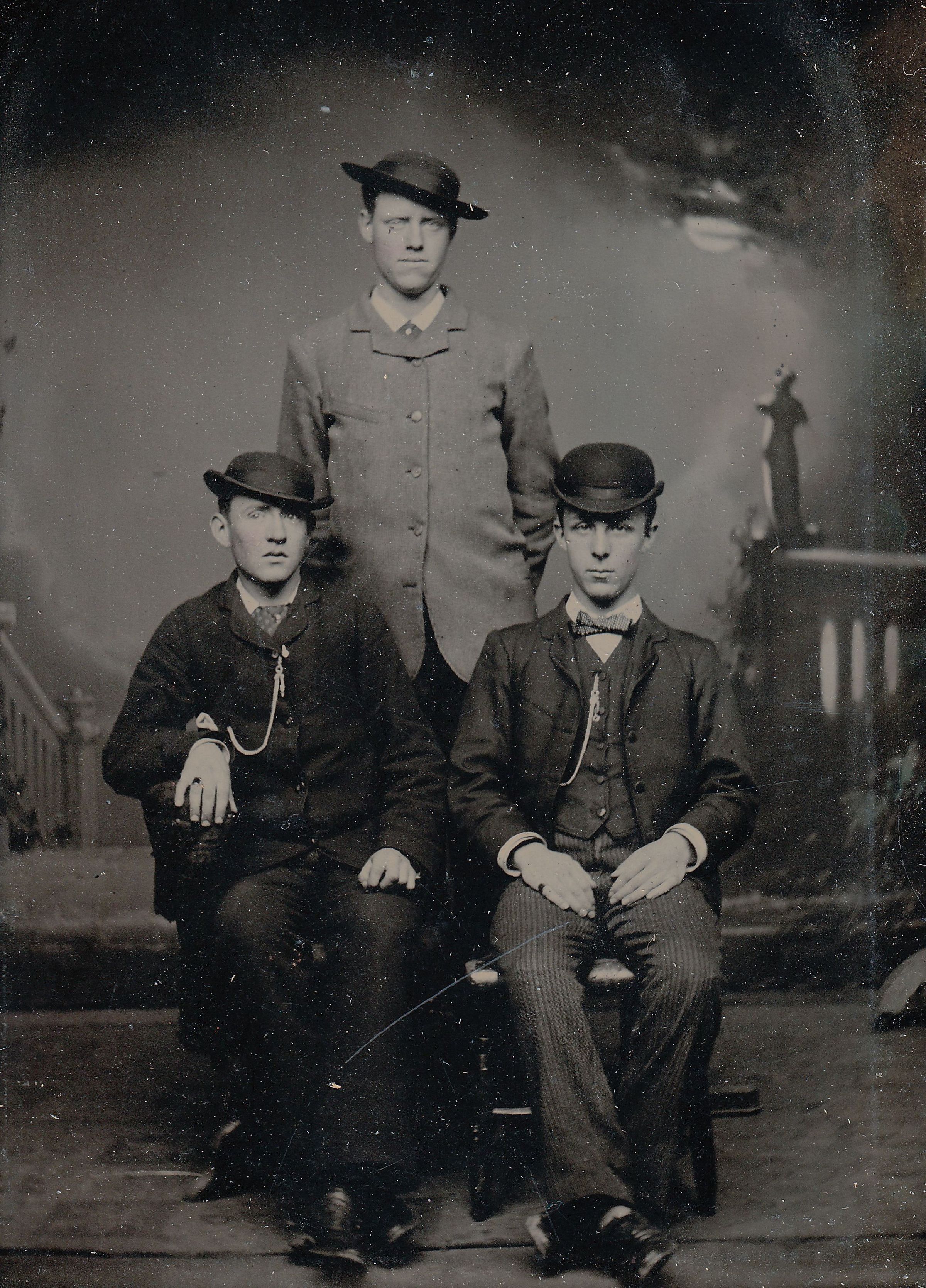 SOURCE CITATION: [Left-Right] BACK ROW - Unidentified, FRONT ROW - Louis Morton Waddell Sr. [1865-1944], Eleazer Luse Denny [1865-1910]; circa 1880-1885; item no. DENN-AN002-0007, Josephine Denny Collection, shared by Farley Toothman; Greene Connections Archives Project (GreeneConnections.com).
