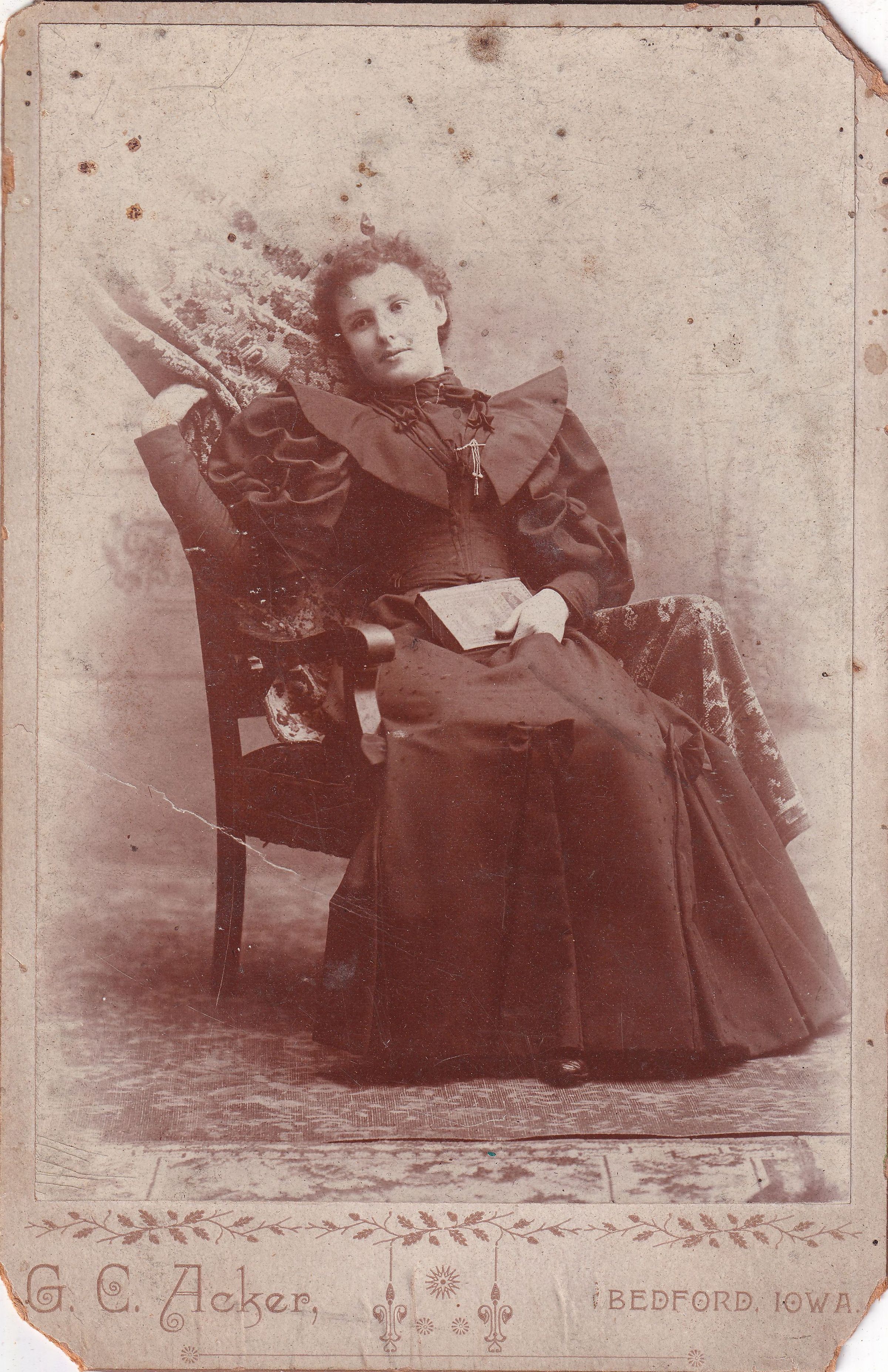 SOURCE CITATION: Elizabeth (Conn) Hatfield [1868-1948]; circa 1890-1895, image by G. C. Acker, Bedford, Iowa; item no. MORS-AN003-0001, Hatfield Series, Ruth Cecilia (Morris) (Shultz) Minor Collection; Greene Connections Archives Project (GreeneConnections.com).