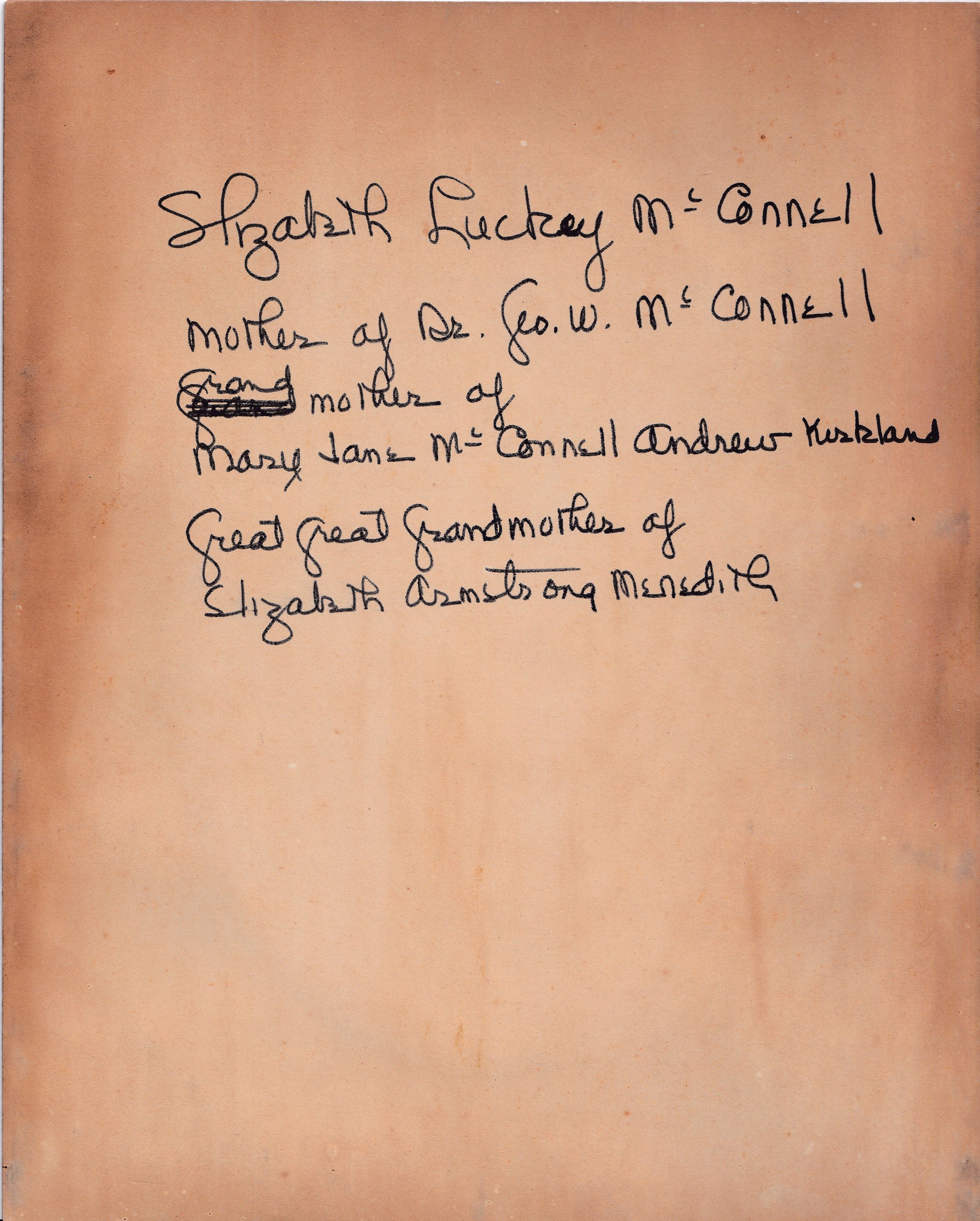 The Anna Mary (Ritchie) Armstrong Series includes items from multiple generations and family members. Notable among the Greene County, Pennsylvania connections are those items that were likely passed down through the descendants of James McConnell [1784-1840] and his wife, Elizabeth (Luckey) McConnell [1786-1863]. Their daughter, Mary Jane (McConnell) (Andrew) Kirkland [1809-1863], was the wife of William Andrew [1801-1850], and the mother of Philinda (Andrew) Ritchie [1847-1919]. Philinda was a Waynesburg College graduate, class of 1869, and the wife of Waynesburg & Washington Railroad President, Joseph Gwynne Ritchie [1834-1891]. Their daughter, Anna Mary (Ritchie) Armstrong [1878-1955], is likely to have been the central figure in accumulating and preserving the family collection, which then passed to her daughter, Elizabeth (Armstrong) Meredith [1906-1990]. The series was donated by Suzanne Floyd in 2022, to the Cornerstone Genealogical Society (144 E. Greene St., PO Box 547; Waynesburg, Pennsylvania 15370). Researched and digitized for the Greene Connections: Greene County, Pennsylvania Archives Project, 2022.