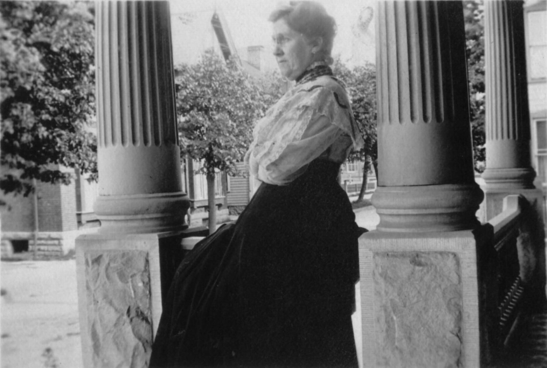 Source Citation: Elizabeth Jane (Fry) Huffman on the porch of the Thomas Jefferson Huffman and Eliza Miranda (Mattox) Huffman family home; item no. REEE-AN003-0009, Huffman Series, Elizabeth Jane (Fry) Huffman Collection, shared by Ed Reed, Greene Connections Archives Project (www.GreeneConnections.com).