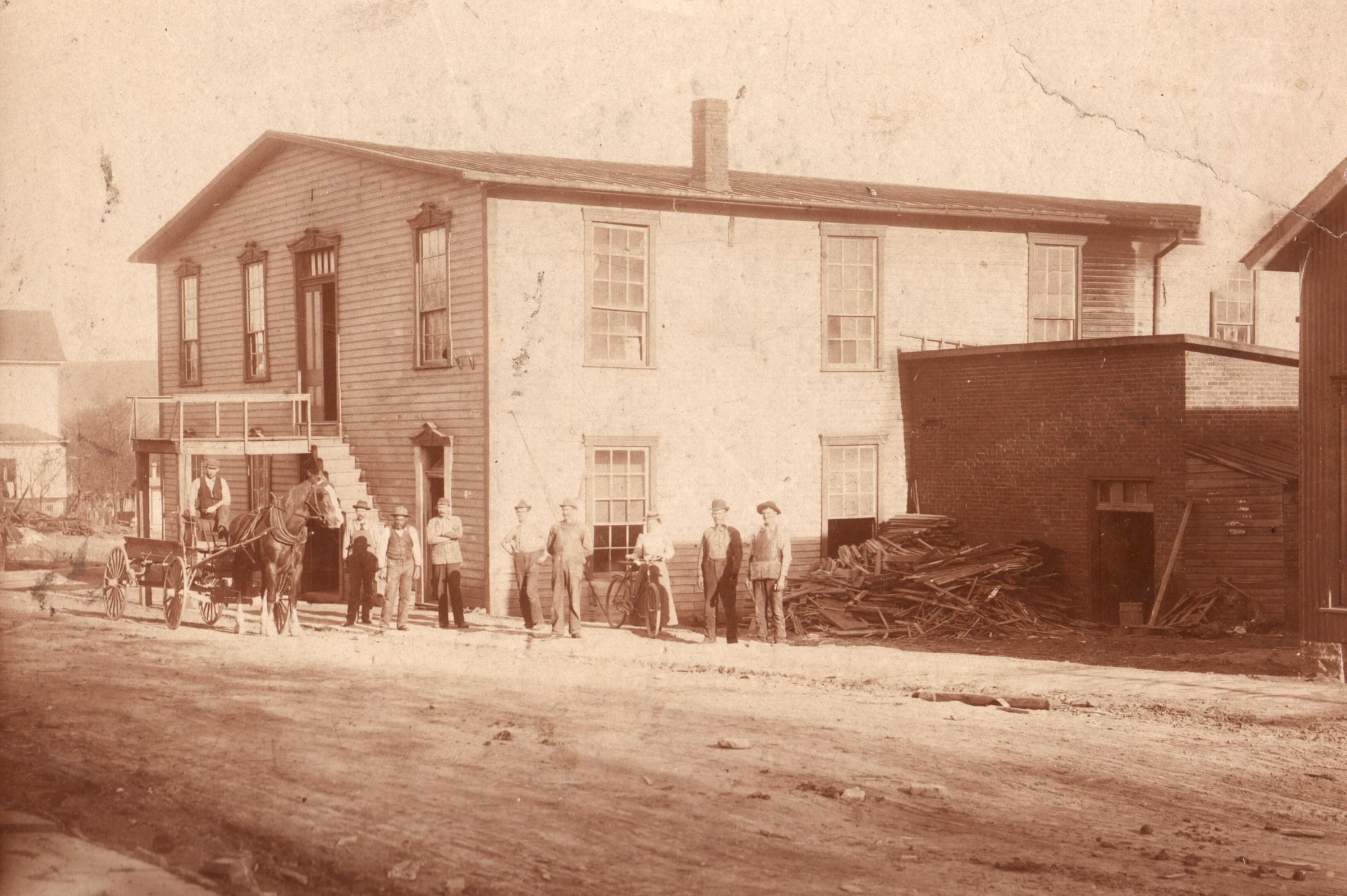 Bicycles, Elms family, Horses, Occupations--Blacksmiths, Waynesburg (Pa.)--Business--Elms Brothers Machine Shop, Waynesburg (Pa.)--Streets--Cumberland Street, Waynesburg (Pa.)--Streets--Greene StreetProvenance