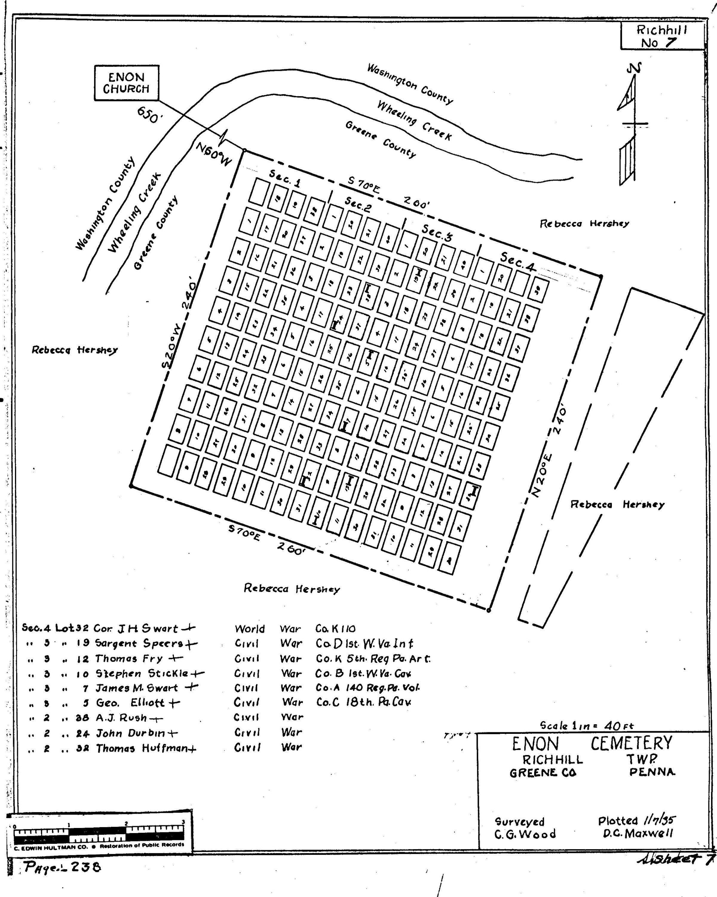 SOURCE CITATION: WPA Cemetery Plat - Pennsylvania - Greene County - Richhill Township - Enon Cemetery (1935); item no. 2016.3.307, Cemetery Plat (WPA) Collection, surveyed by Works Projects Administration, copy on file at the Clerk of Courts Office, Greene County Courthouse; Greene Connections Archives Project (GreeneConnections.com).