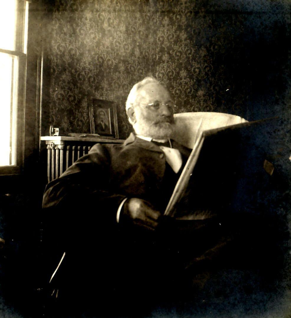 Handwritten inscription on back of photograph reads, "Ethelbert H. Grabill, Class of 1855, Waynesburg. Taken about his 77th year in 1907, Springfield, Mo. The picture back of his chair (which was in his study) is that of his father, Nimrod Grabill, of Pennsylvania."Photograph Details