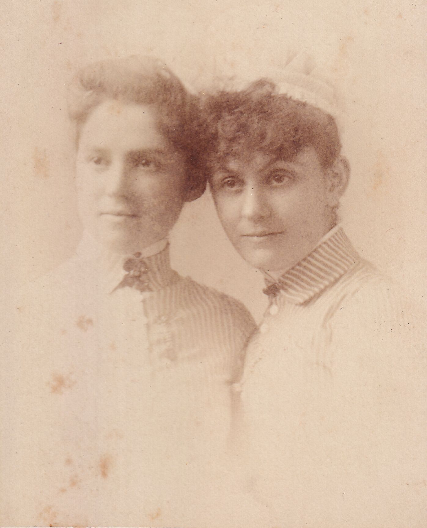 SOURCE CITATION: Phelan-Walker Album, Photo 36 - [Left-Right] Rebecca Arabelle "Belle" Rinehart [1863-1956] and Unidentified; circa 1880-1890, image by Theo. Endean, 122 Euclid Ave.; item no. WAYN-AN008-0036, Waynesburg University Paul R. Stewart Museum Collection, Greene Connections Archives Project (www.GreeneConnections.com).