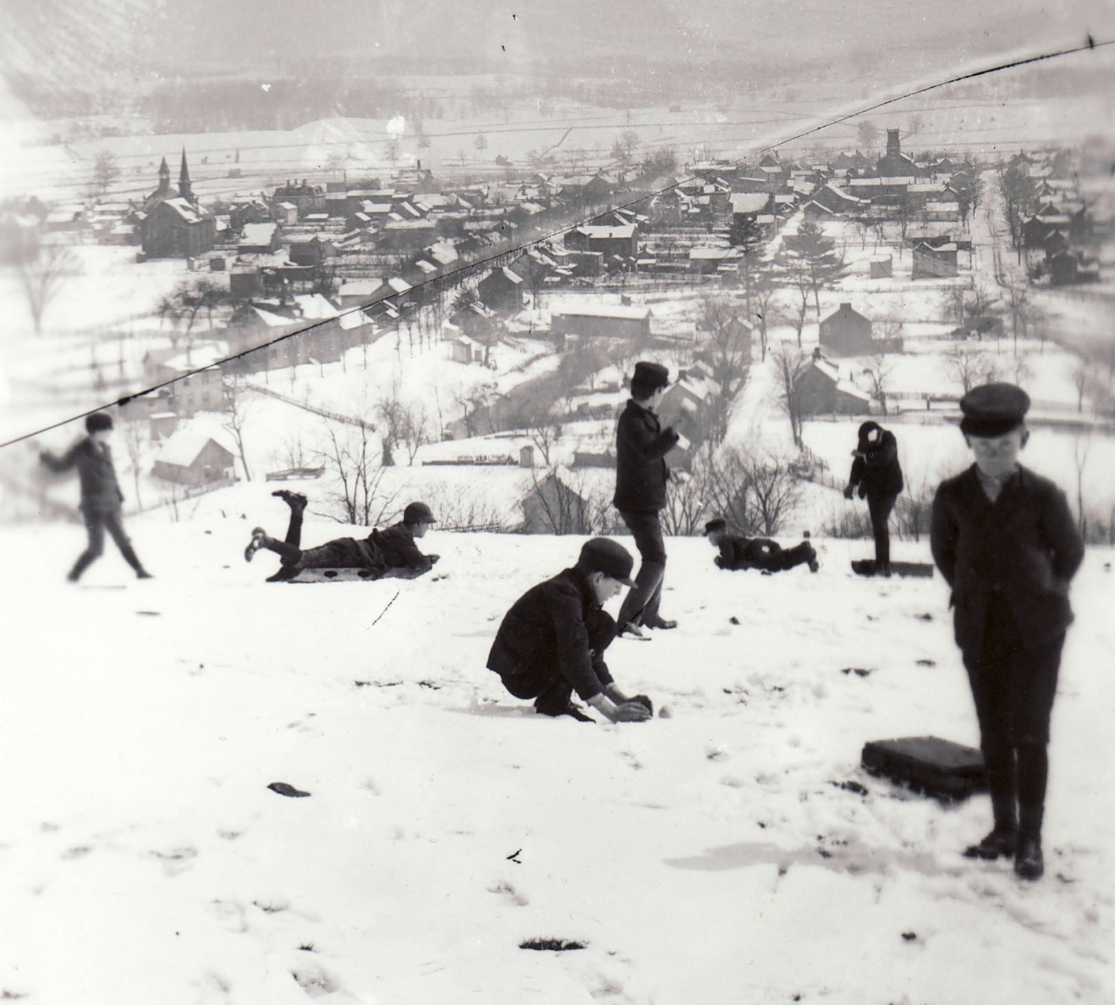 Source Citation: Sledding on Town Hill north of Carmichaels, Greene County, Pennsylvania; circa 1895-1901; item no. GCHS-AN027-0004-0001, Greene County Historical Society Collection, Greene Connections Archives Project (GreeneConnections.com).