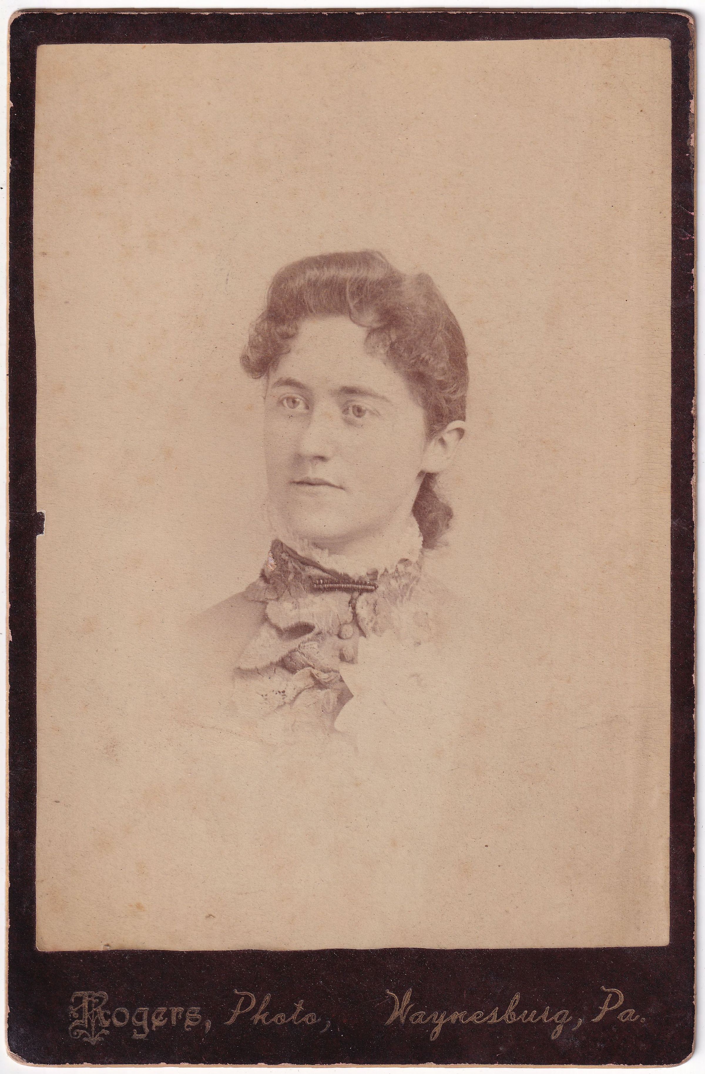 SOURCE CITATION: Elizabeth "Lizzie" (Inghram) Rinehart [1869-1956]; circa 1885-1890, image by Rogers, Photo, Waynesburg, Pa.; item no. DENN-AN003-0001, Josephine Denny Collection, shared by Farley Toothman; Greene Connections Archives Project (GreeneConnections.com).