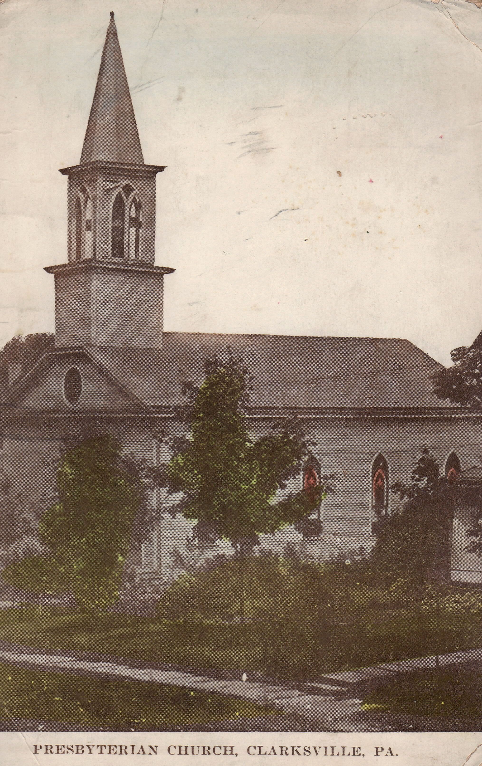 SOURCE CITATION: Real-photo postcard of the Presbyterian Church in Clarksville, Greene County, Pennsylvania; circa 1900-1920; item no. RUSH-AN001-0007-0002, Walter Markiewich Postcard Collection, shared by Brice and Linda Rush; Greene Connections Archives Project (GreeneConnections.com).