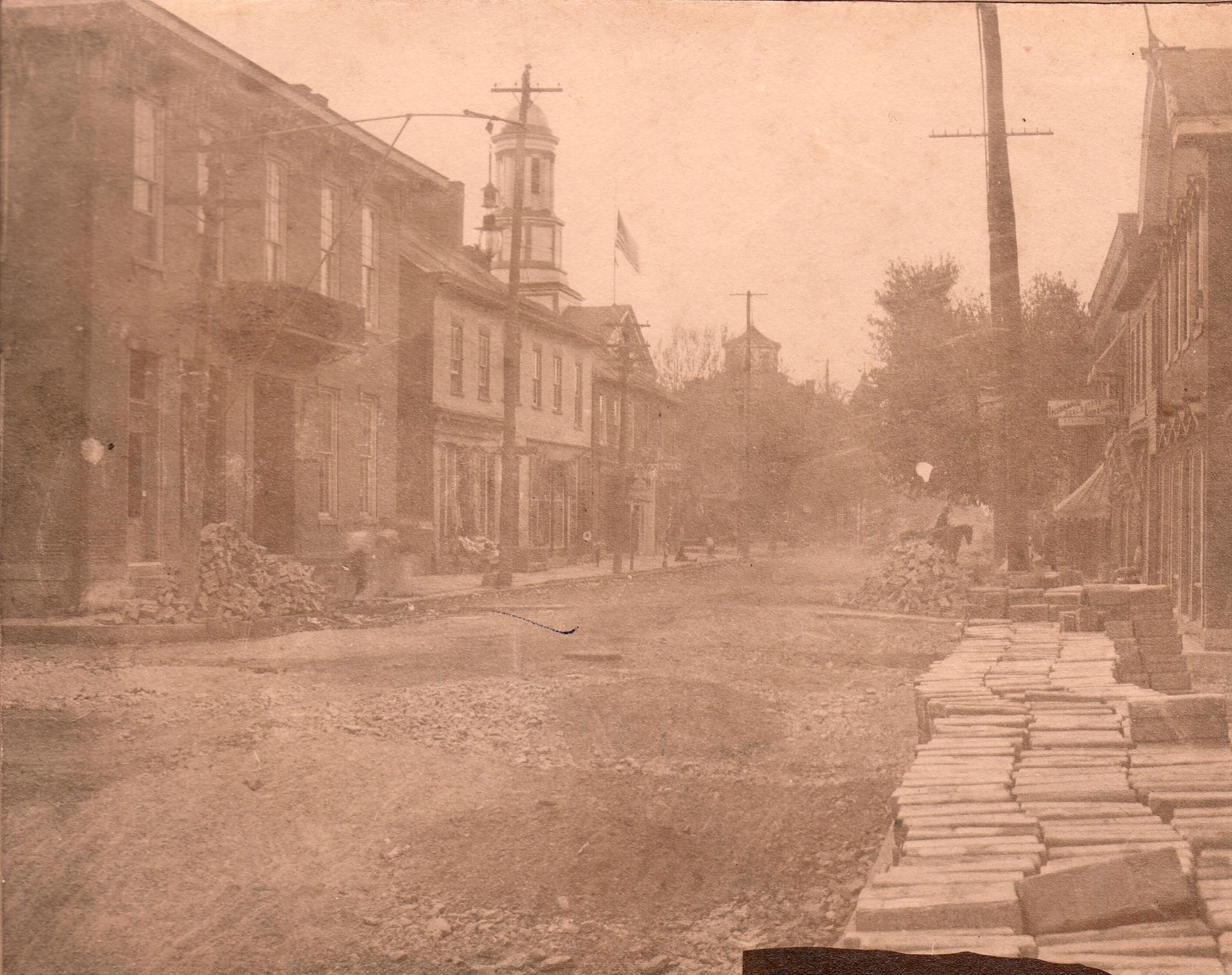 Brick roads, Greene County Courthouse (Waynesburg, Pa.), Occupations--Road workers, Waynesburg (Pa.)--Business--Downey House, Waynesburg (Pa.)--Business--Farmers and Drovers Bank, Waynesburg (Pa.)--Business--Green House, Waynesburg (Pa.)--Streets--High StreetOther Names and Numbers