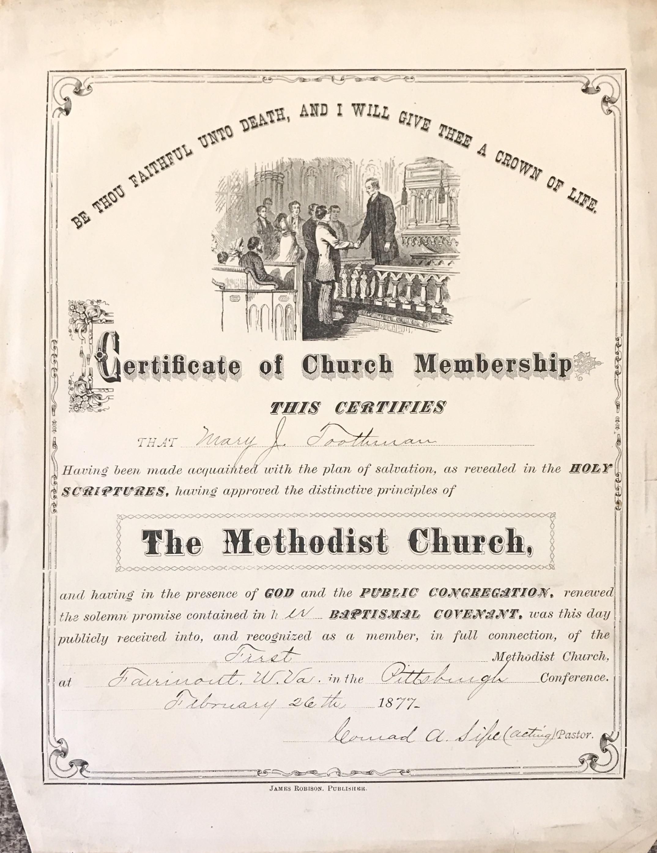 SOURCE CITATION: First Methodist Church (Fairmont, West Virginia) membership - Mary J. [sic Martha J.] Toothman (certificate, 26 February 1877); item no. TOOG-AN003-0001-0006, Toothman Series, Glenn Jacob Roy Thornton Toothman III Collection, Greene Connections Archives Project (www.GreeneConnections.com).