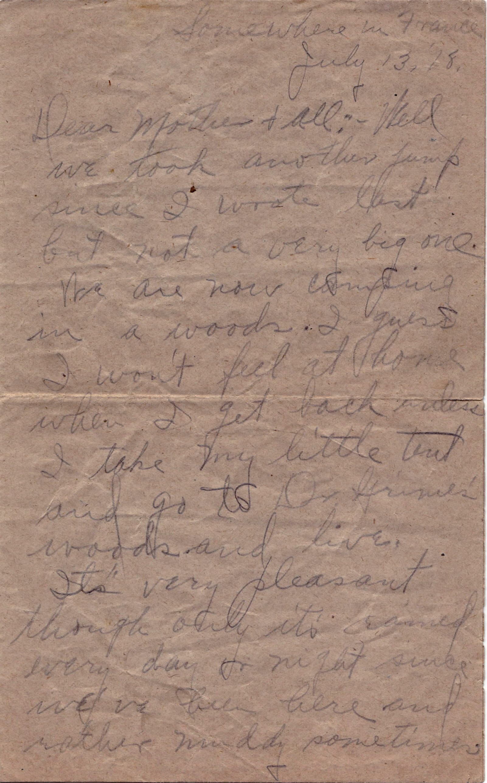 "Somewhere in France / July 13, '18. / Dear Mother & all: - Well / we took another jump / since I wrote last but / not a very big one. / We are now camping / in a woods. I guess / I won't feel at home / when I get back unless / I take my little tent / and go to Dr. Grimes' / woods and live. / It's very pleasant / though only it's rained / every day & night since / we've been here and / rather muddy sometimes."