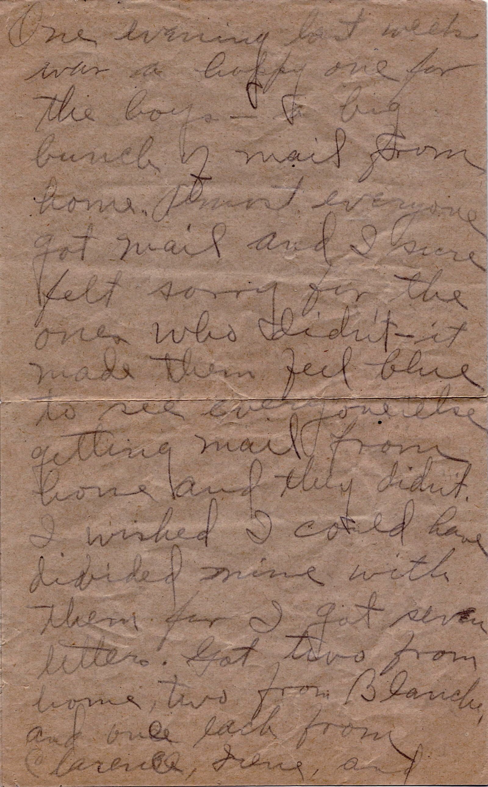 "One evening last week / was a happy one for / the boys - a big / bunch of mail from / home. Almost everyone / got mail and I sure / felt sorry for the / ones who didn't - it / made them feel blue / to see everyone else / getting mail from / home and they didn't. / I wished I could have / divided mine with / them for I got seven / letters. Got two from / home, two from Blanche, / and one each from / Clarence, Irene, and"