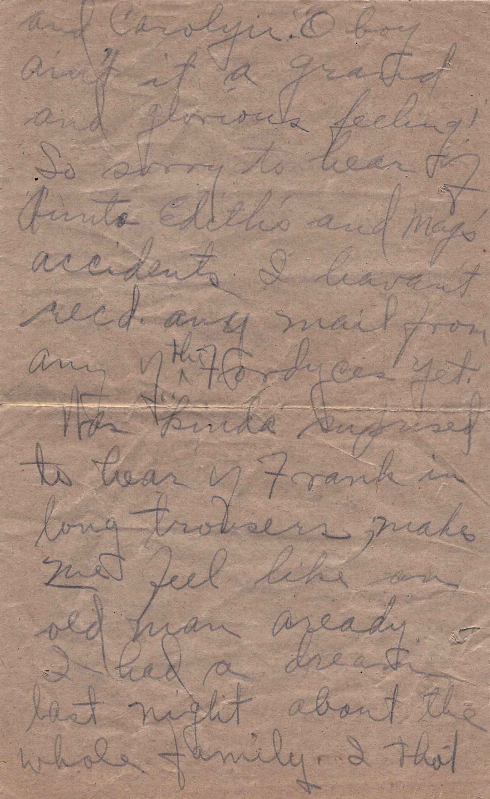 "and Carolyn. O boy / ain't it a grand / and glorious feeling! / So sorry to hear of / Aunts Edith's and Mag's / accidents. I haven't / recd. any mail from / any of the Fordyces yet. / Was kinda surprised / to hear of Frank in / long trousers, makes / me feel like an / old man aready. / I had a dream / last night about the / whole family. I thot"