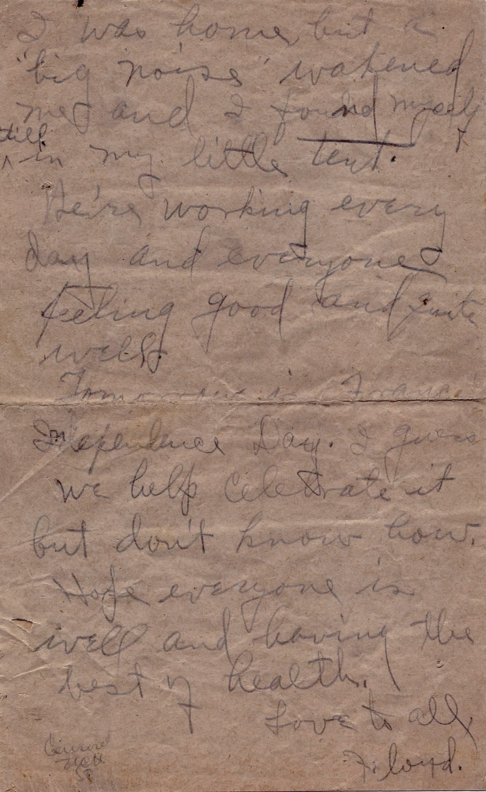 "I was home, but a / 'big noise' wakened / me and I found myself / still in my little tent. / We're working every / day and everyone / feeling good and quite / well. / Tomorrow is France's / Independence Day. I guess / we help celebrate it / but don't know how. / Hope everyone is / well and having the / best in health. / Love to all, / Floyd"Collection