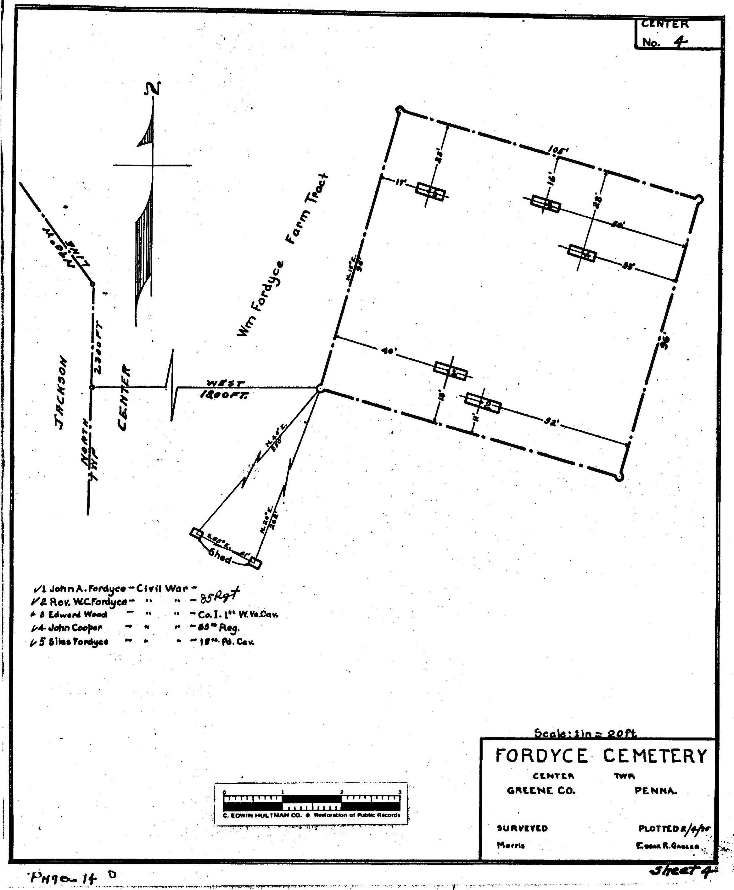 Source Citation: WPA Cemetery Plat - Pennsylvania - Greene County - Center Township - Fordyce Cemetery (1935), item no. 2016.3.25, Cemetery Plat (WPA) Collection, surveyed by Works Projects Administration, copy on file at the Clerk of Courts Office, Greene County Courthouse, Greene Connections Archives Project (www.GreeneConnections.com).