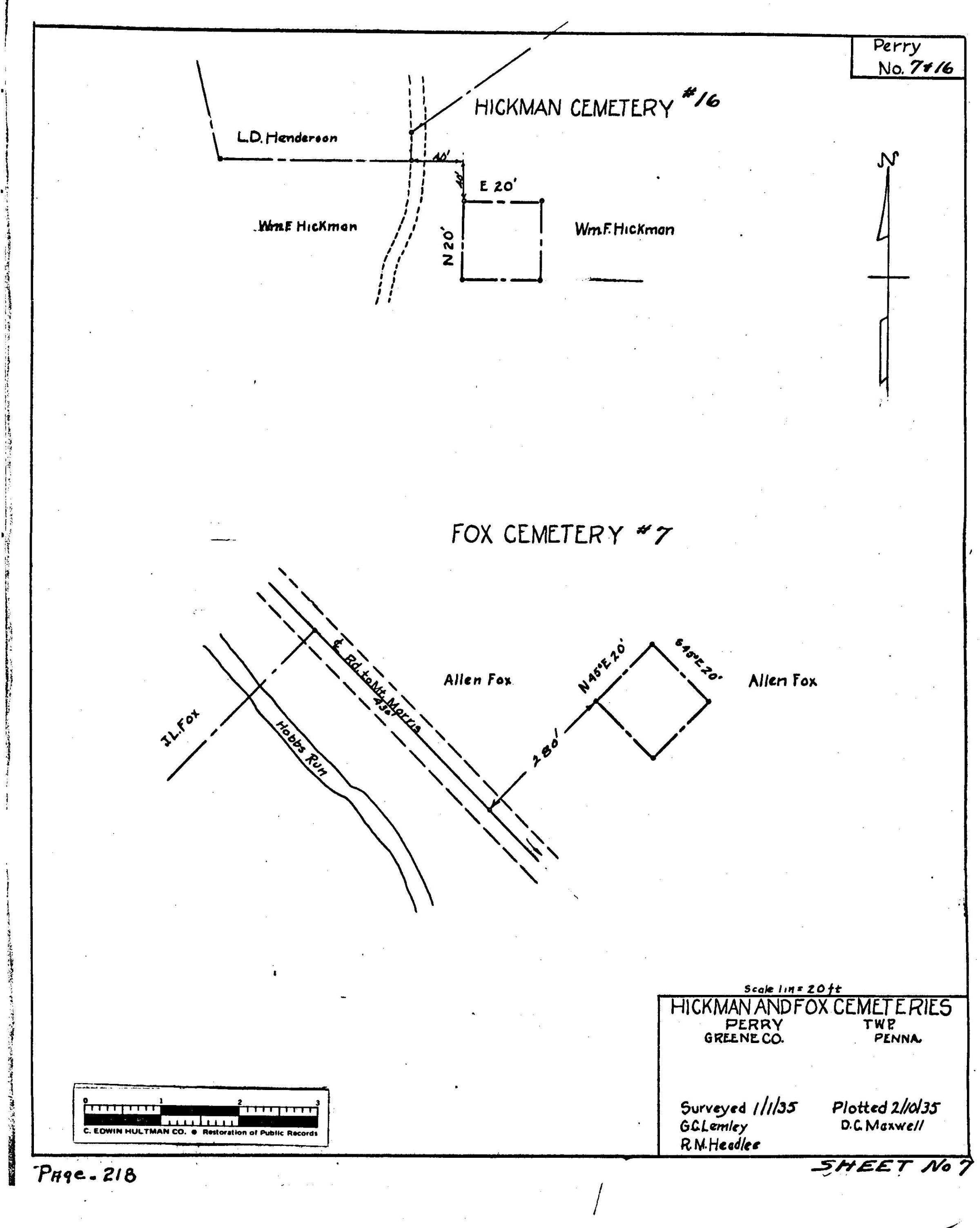 SOURCE CITATION: WPA Cemetery Plat - Pennsylvania - Greene County - Perry Township - Fox Cemetery (1935), item no. 2016.3.81, Cemetery Plat (WPA) Collection, surveyed by Works Projects Administration, copy on file at the Clerk of Courts Office, Greene County Courthouse, Greene Connections Archives Project (www.GreeneConnections.com).