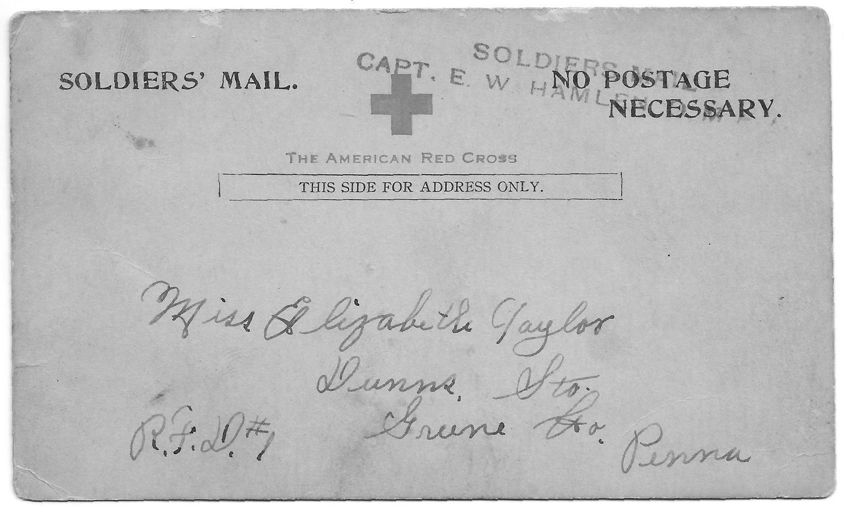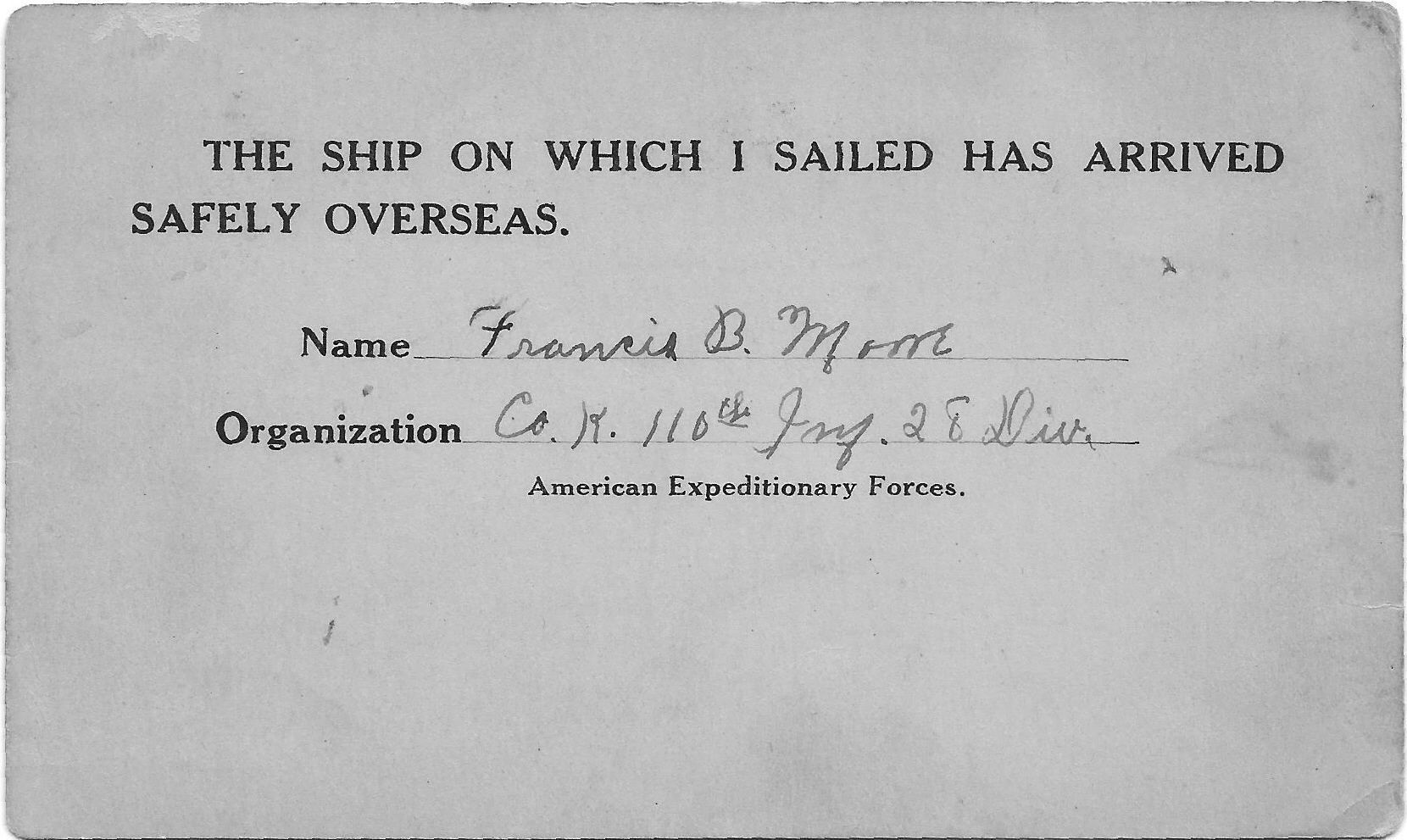 Source Citation: Francis B. Moore (Company K, 110th Infantry, 28th Division) to Elizabeth Taylor (Dunns Station, Greene County, Pennsylvania); item no. TAYL-AN001-0004, Elizabeth Taylor Collection, shared by H. Taylor, Greene Connections Archives Project (www.GreeneConnections.com).