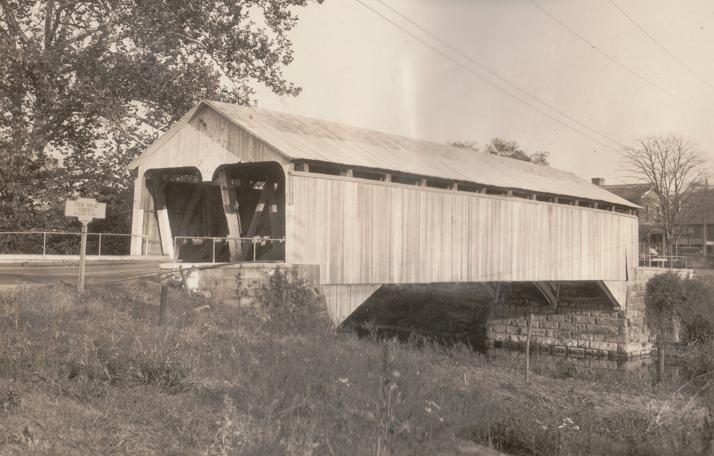 Source Citation: Frank Jones Album - Double-lane covered bridge over Ten Mile Creek, located near the intersection of High and Greene Streets in Waynesburg, Greene County, Pennsylvania, item no. GILB-AN001-0001-0118, Frank Jones Album Series, Zenia Gilbert Collection, Greene Connections Archives Project (www.GreeneConnections.com).