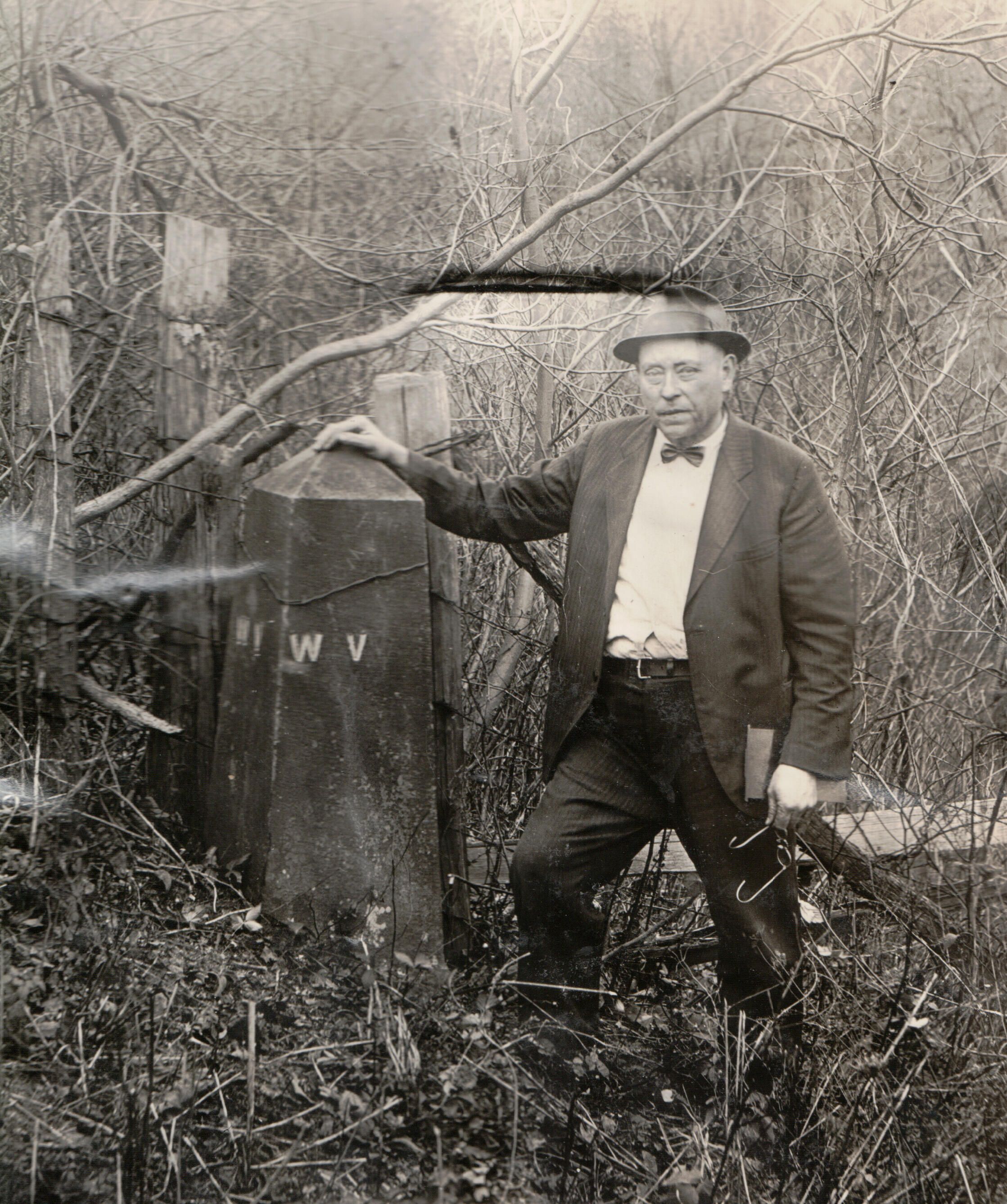 SOURCE CITATION: Frank Blair Jones Album - Frank Blair Jones at the southwest marker along the Pennsylvania / West Virginia border; dated 6 November 1937; item no. GILB-AN001-0001-0017, Frank Jones Album Series, Zenia Gilbert Collection; Greene Connections Archives Project (GreeneConnections.com).