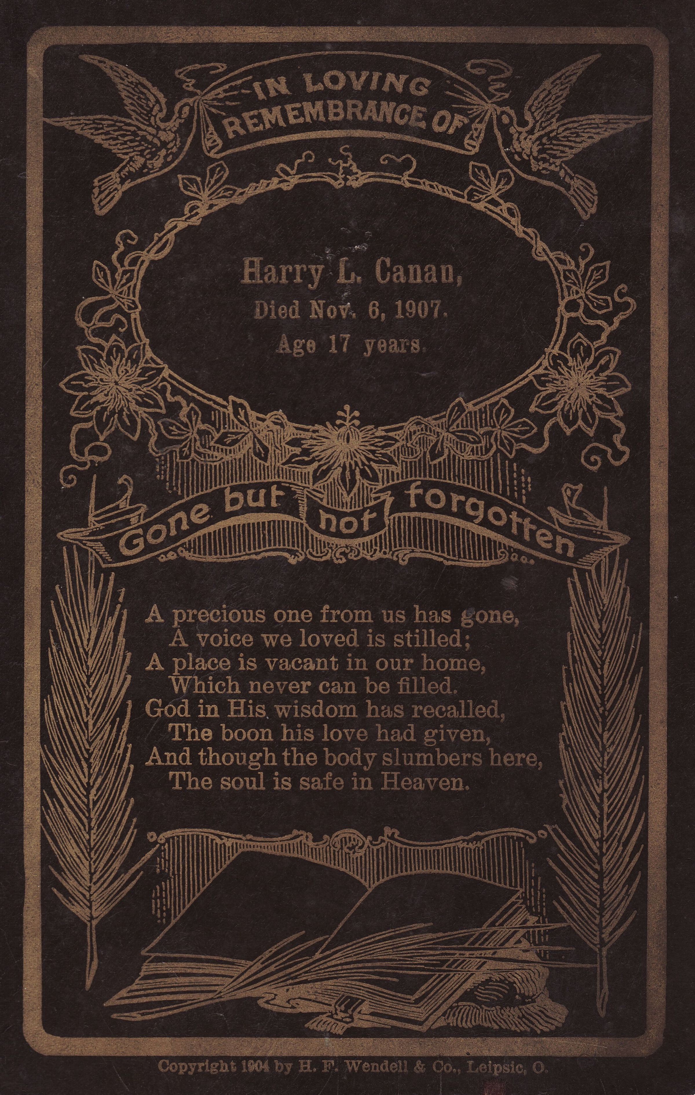 SOURCE CITATION: Funeral card of Harry Lee Canan [1890-1907]; printed by H. F. Wendell & Co., Leipsic, O.; item no. CGSP_AN006_0004_0004, Esther Ruth Hart Series, Cornerstone Genealogical Society Collection; Greene Connections Archives Project (GreeneConnections.com).
