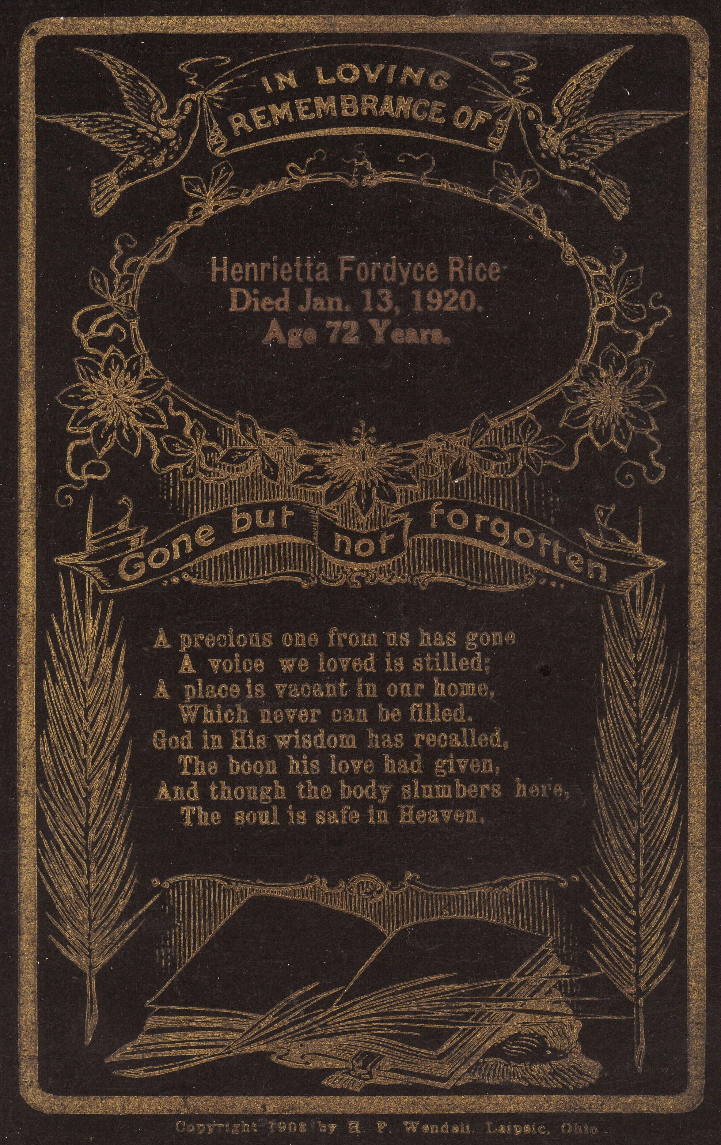 Source Citation: Funeral card of Henrietta (Fordyce) Rice [1846-1920]; dated 1920, printed by H. F. Wendell, Leipsic, Ohio; item no. RICE-AN001-0004-0002, John Robert Rice Collection, Greene Connections Archives Project (www.GreeneConnections.com).