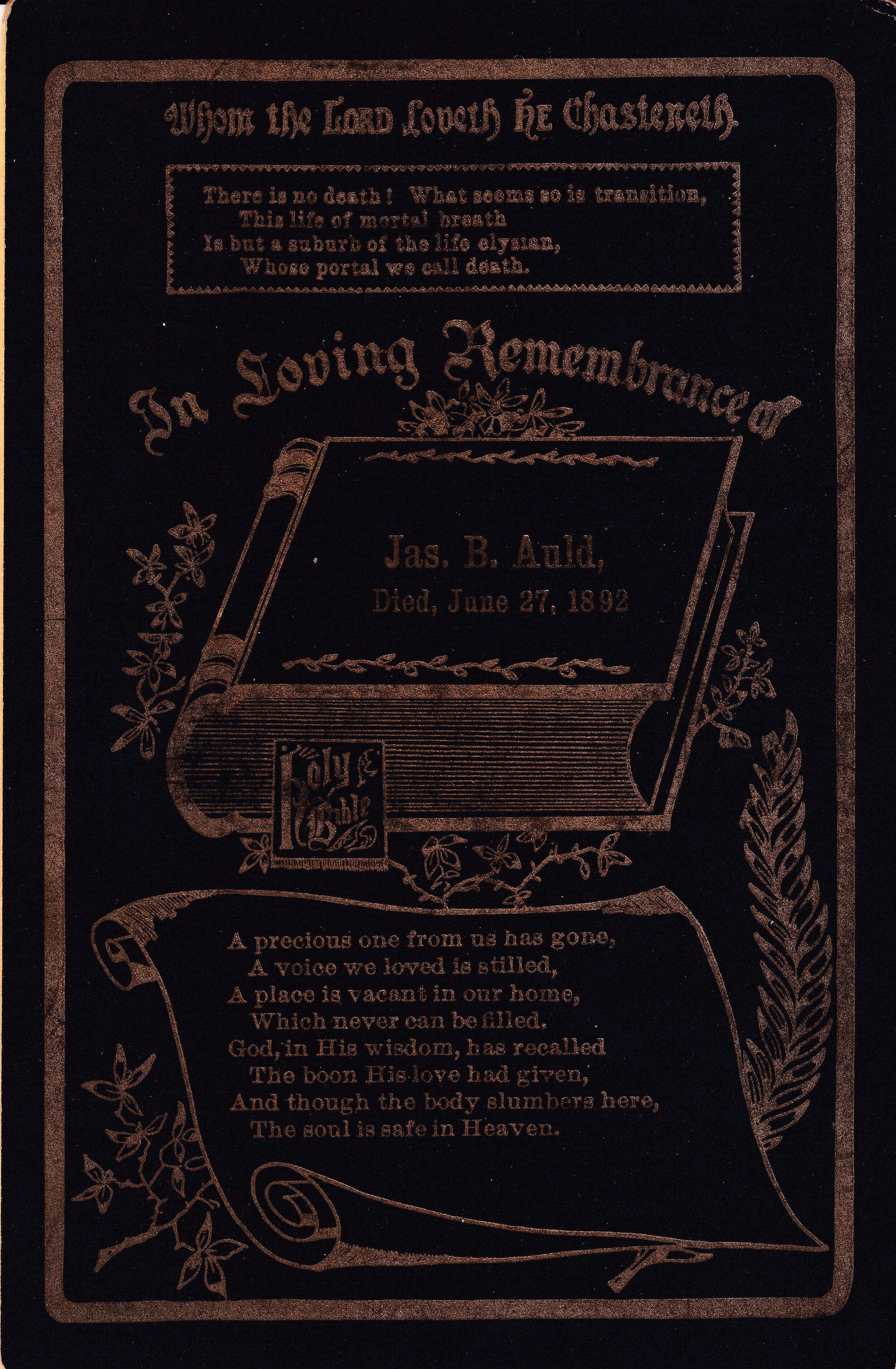 The funeral card reads, "Jas. B. Auld, Died, June 27, 1892."